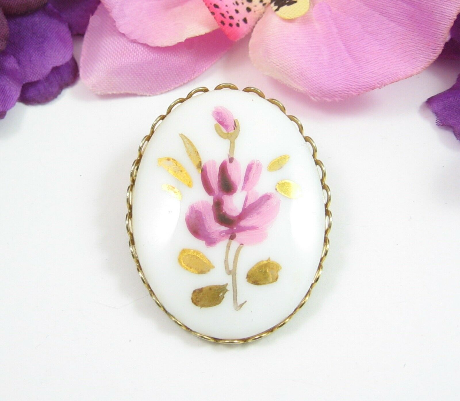 Hand Painted PINK FLOWER White Porcelain Inset PIN Vintage Oval Brooch Goldtone