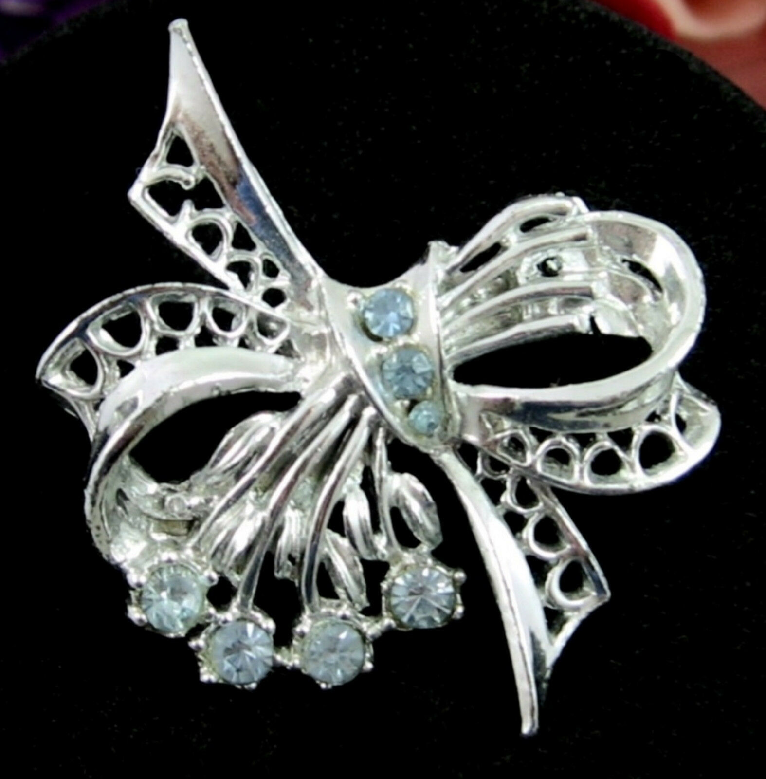 BOW BROOCH Vintage Light BLUE RHINESTONE PIN Silvertone Spray Lacy Ribbon 2"