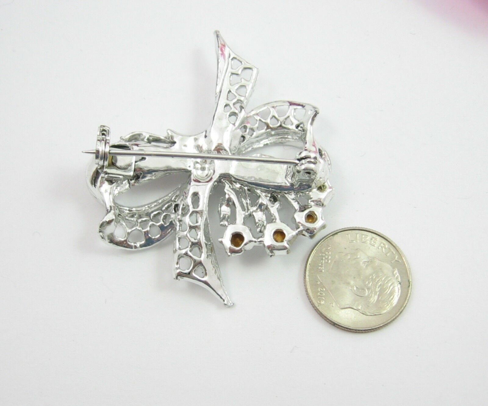 In a silvertone metal, this vintage RHINESTONE PIN is a RIBBON BOW with a SPRAY of flower blooms!