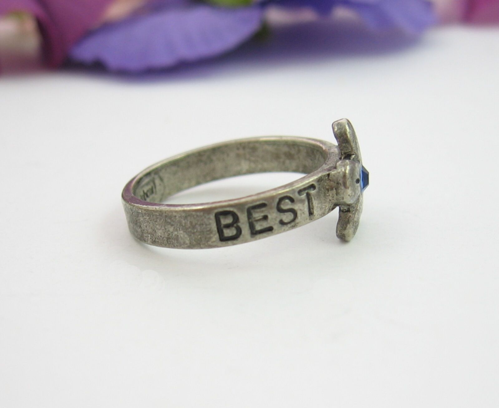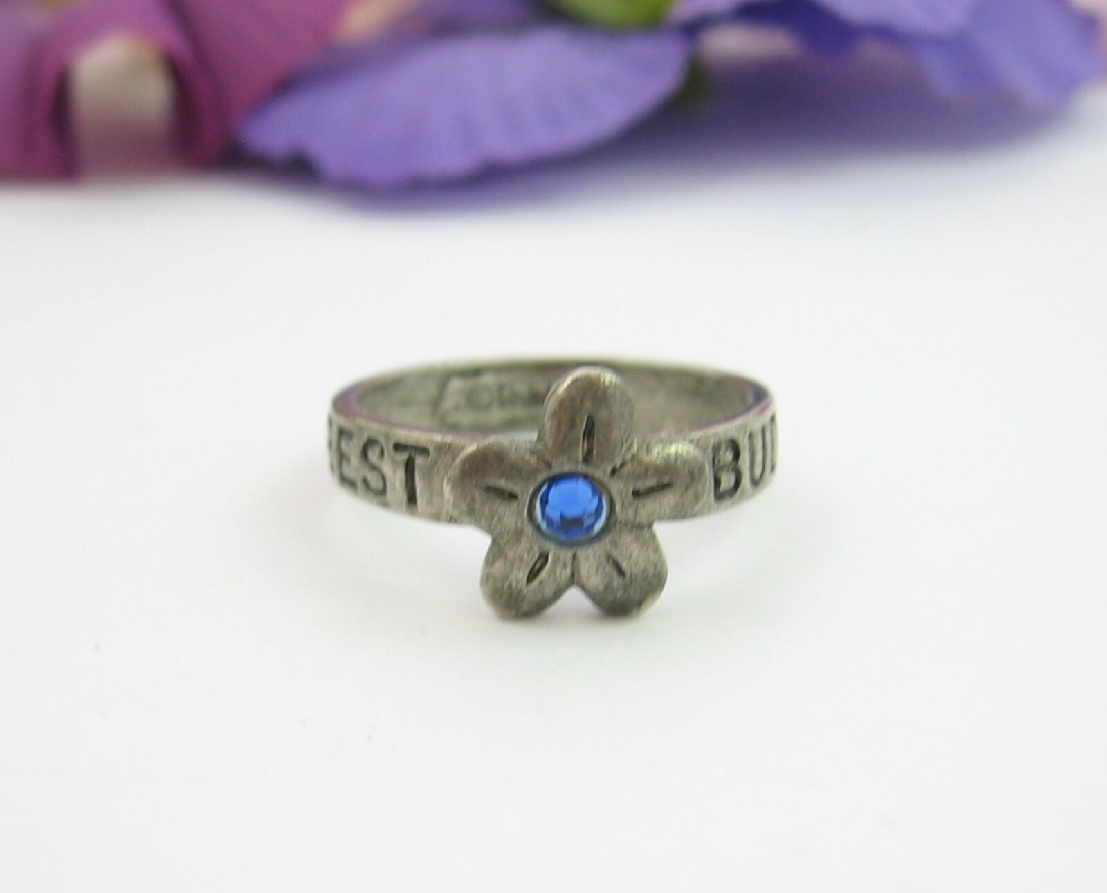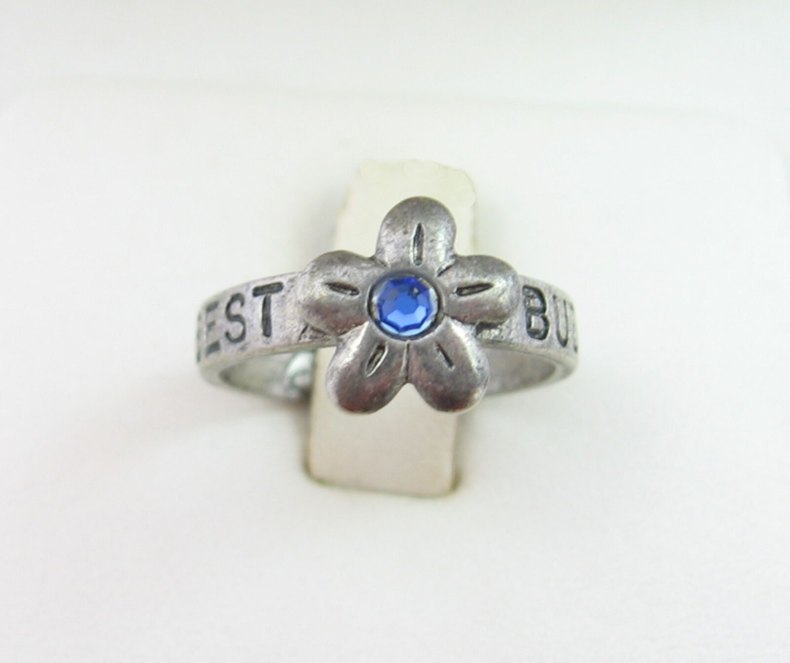 Vintage BEST BUDS Flower RING Blue Rhinestone Friends Silvertone Signed Rainbow Size 6.5