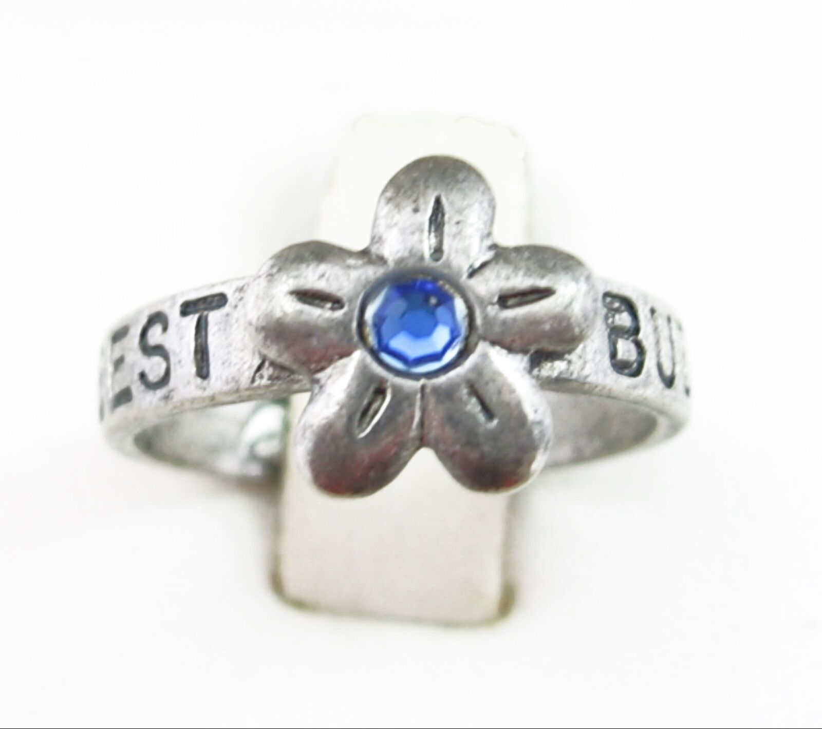 BEST BUDS Flower RING Blue Rhinestone Friends Silvertone Signed Rainbow Size 6.5