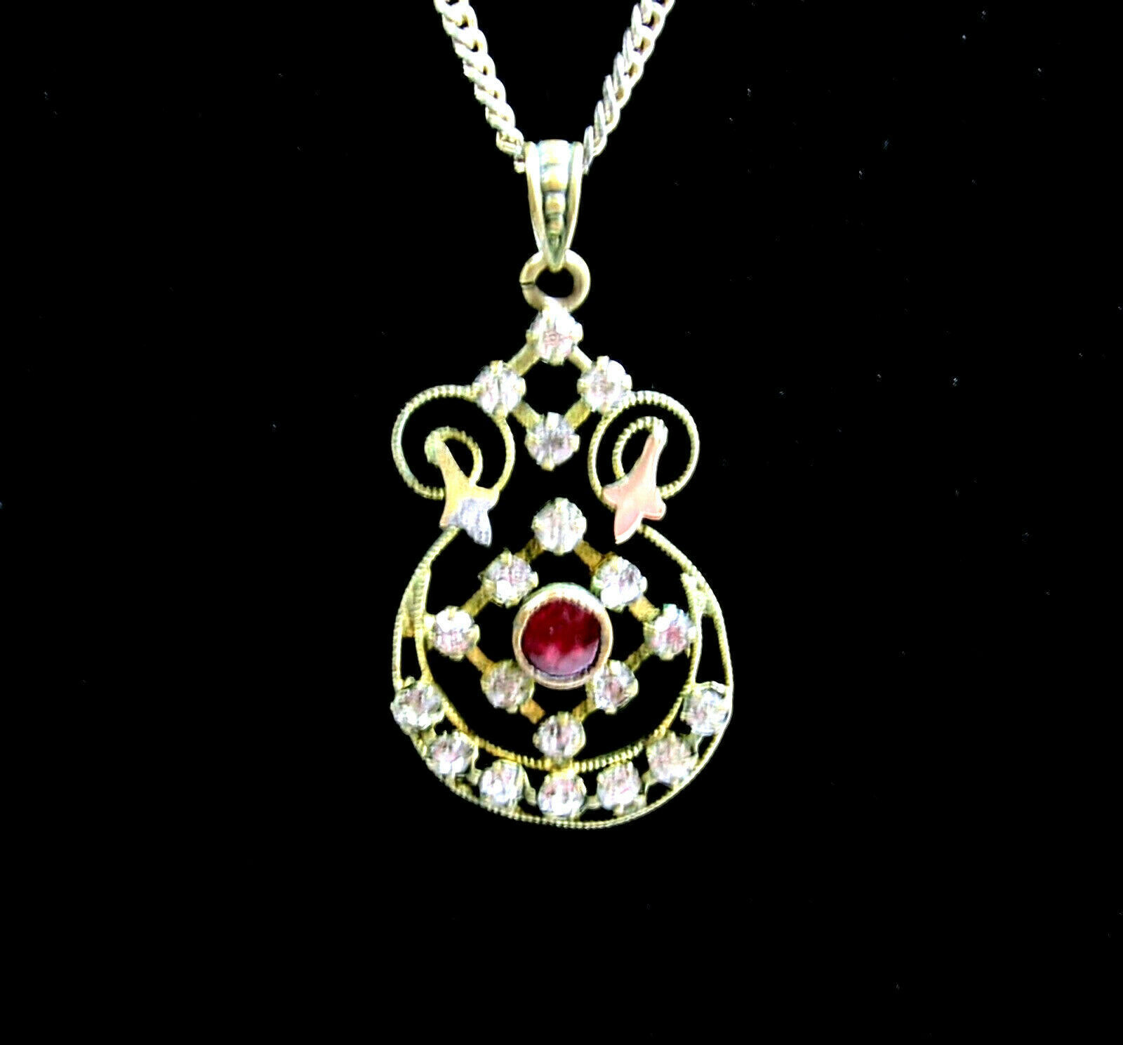 At the center is a smoother dark pink-red stone. The "clear" stones surrounding it have gone dark with age.