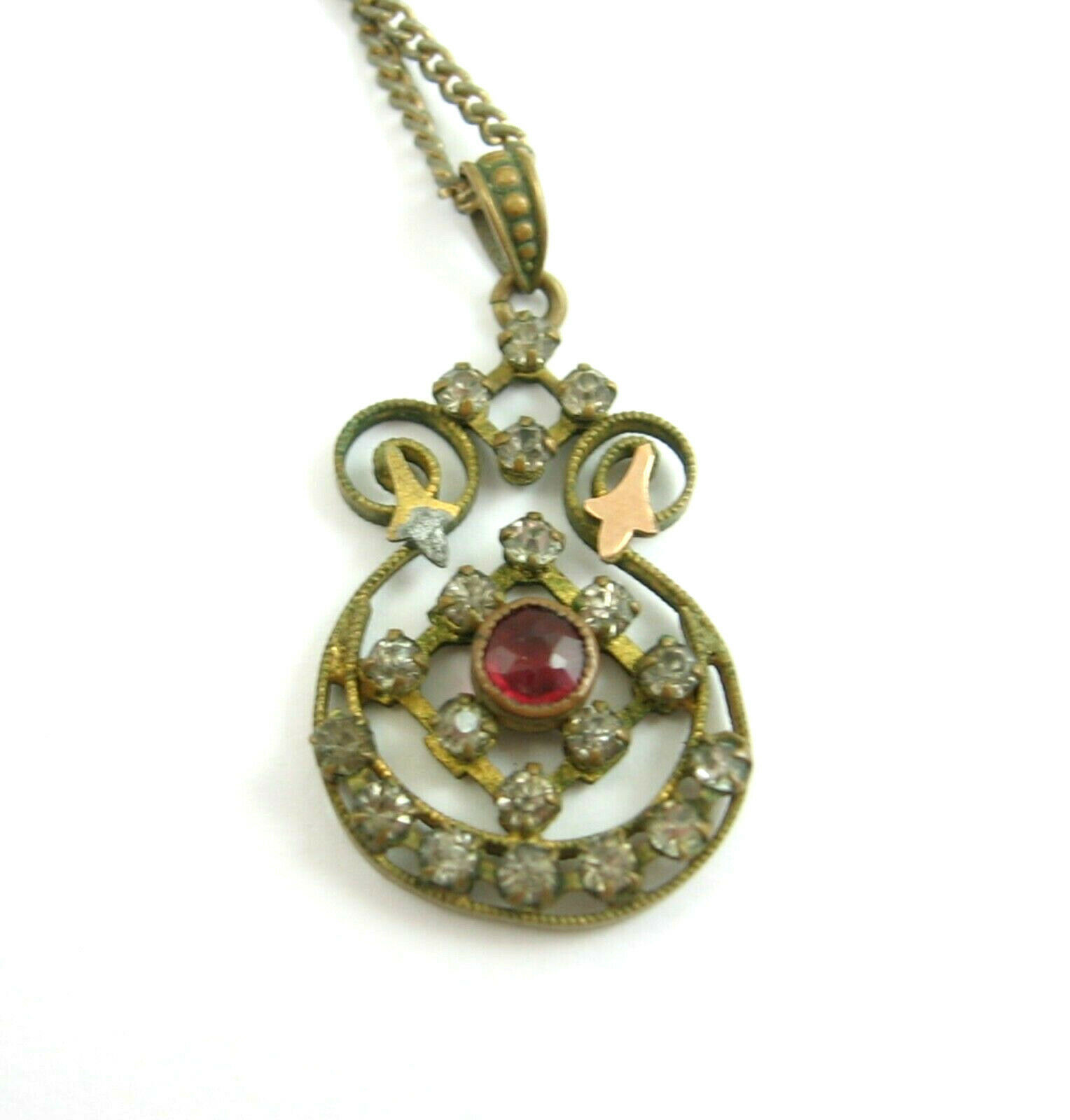 Rhinestones & Pink Red Stone PENDANT Goldtone NECKLACE Vintage 18" Length