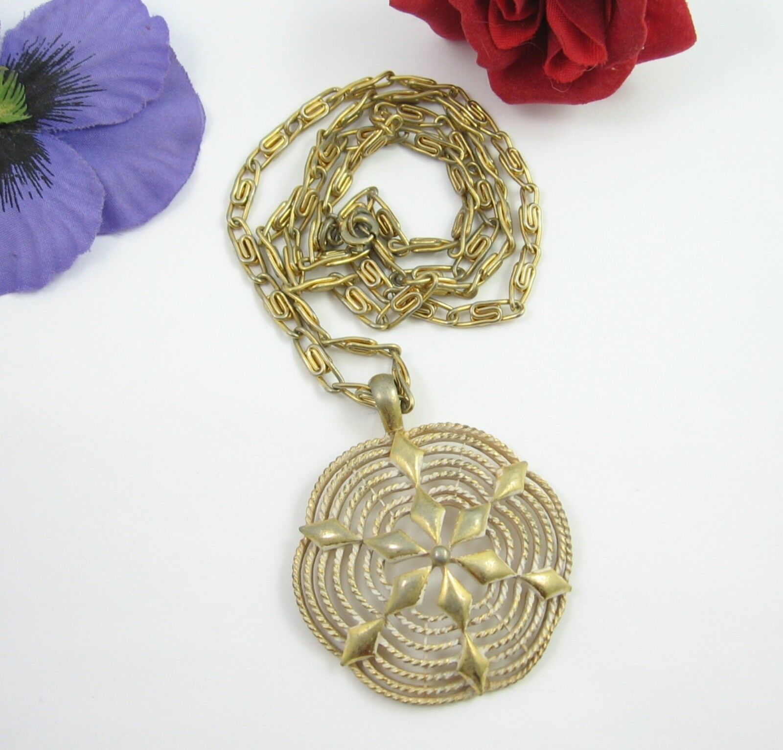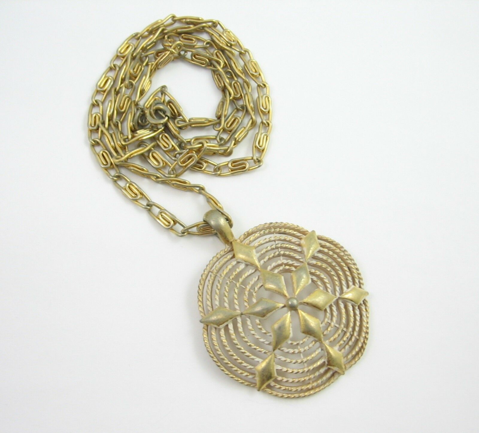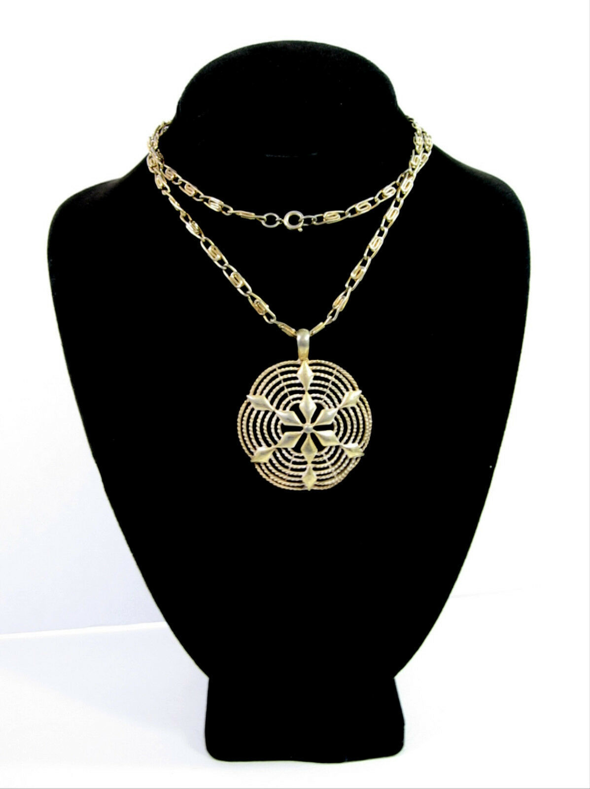 SPIDERWEB MEDALLION Vintage NECKLACE Goldtone Round Pendant, Chain 26"