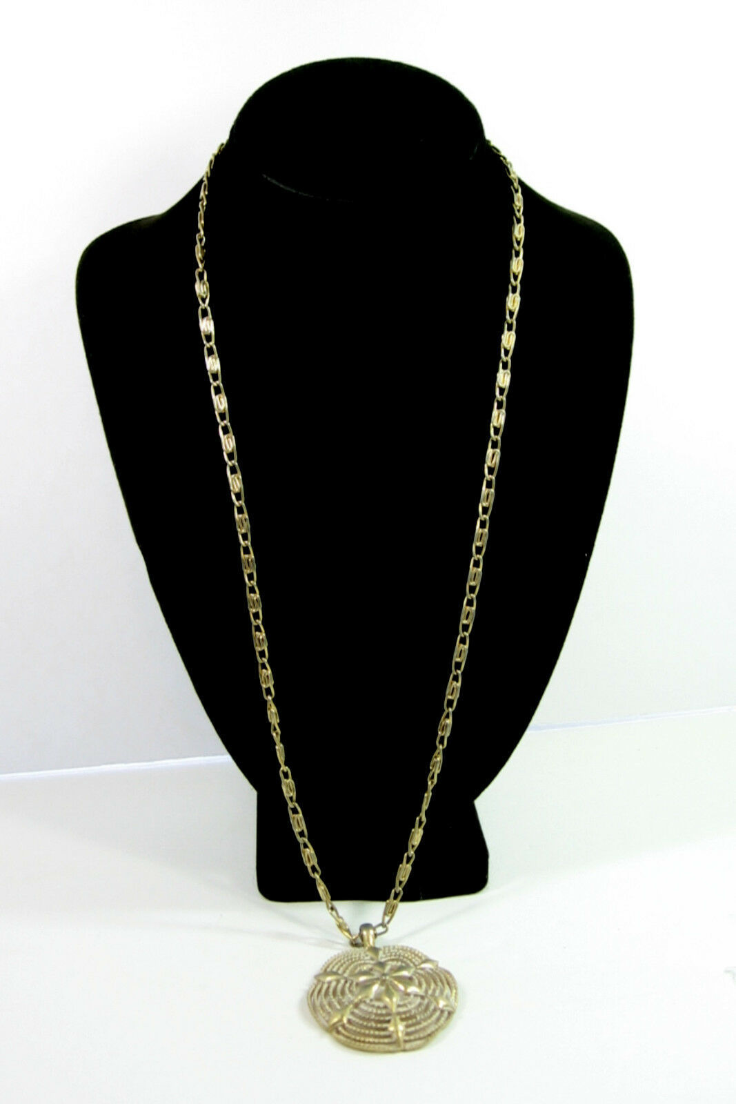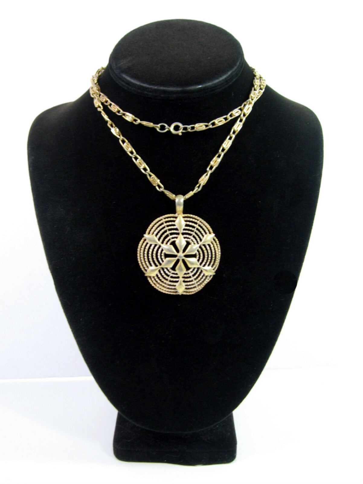 In a goldtone metal, this vintage Necklace has a Rounded MEDALLION style pendant with a Spiderweb design!