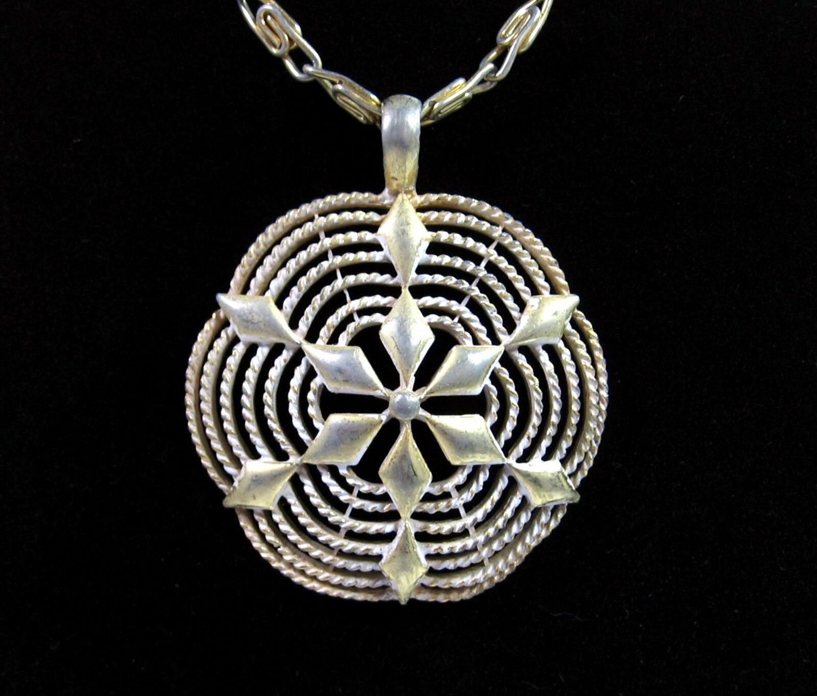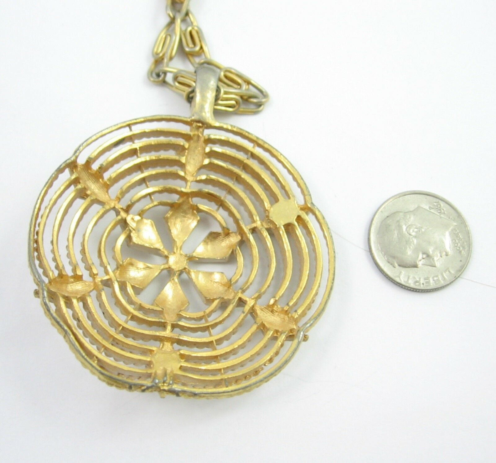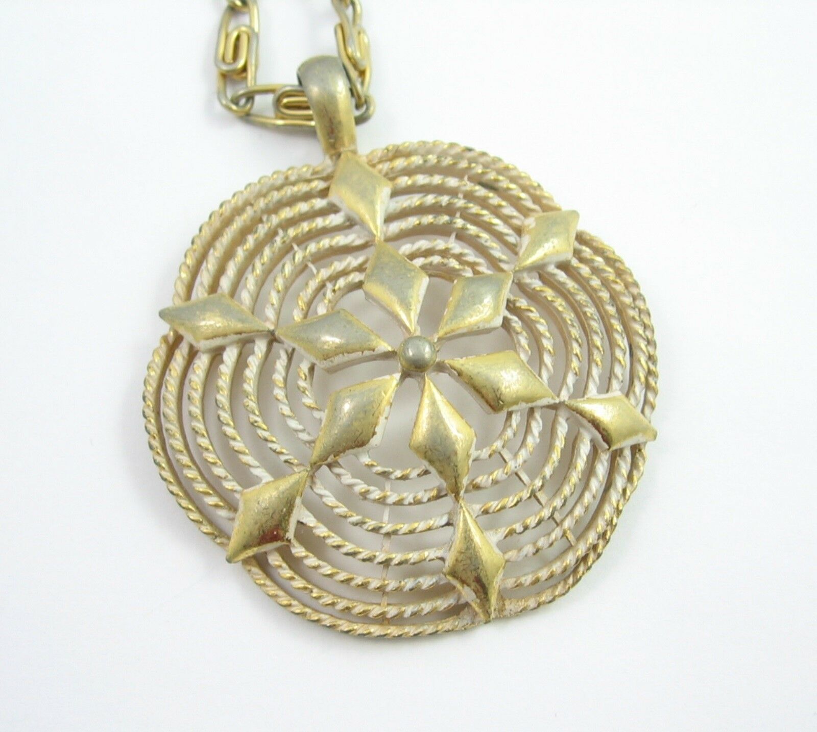 Vintage WHITE SPIDERWEB MEDALLION Vintage Pendant NECKLACE Goldtone Round, Chain 26"