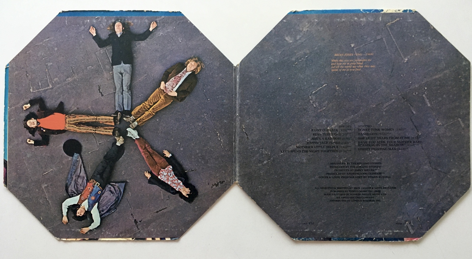 In September, Through the Past, Darkly (Big Hits Vol. 2), dedicated to Jones, appeared with an octagonal-shaped album cover. Because their first "Big Hits" compilation had been released in separate formats, with the Aftermath-era material appearing only on its UK edition, the American edition of "Big Hits Vol. 2" included hit singles from the "Aftermath" period.