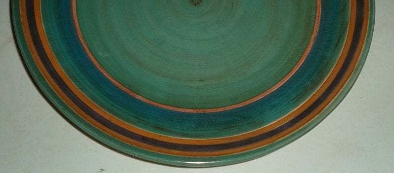 I have several of these plates in my store and each piece is individually designed, wheel thrown, hand dipped high fired.