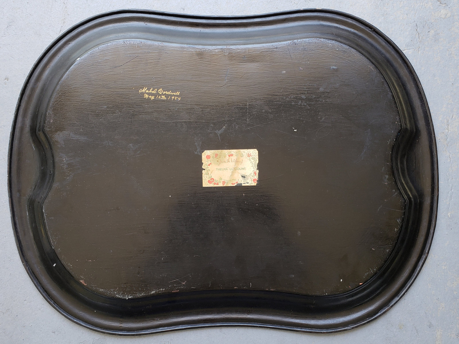 VINTAGE 1954 DECORATIVE METAL SERVING TRAY THAT IS HAND PAINTED AND DECORATED BY MABEL CORDWELL WITH DATE AND ENGRAVED SIGNATURE. THIS PIECE WAS HELD CV IN THE HOME OF THELMA LE COUNT. ITEM IS IN VERY GOOD CONDITION AS DISPLAYED IN THE PHOTO GALLERY. ITEM MEASURES 24 BY 18 INCHES AND APPROXIMATELY 1/2 INCH IN HEIGHT.