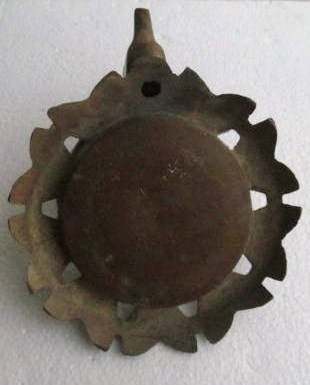 Measures approx 3" in height at the tallest point, 6 1/4" front to back and 4 1/2" in diameter. Will accommodate a 3" pillar candle. Stamped on the back with a symbol mark