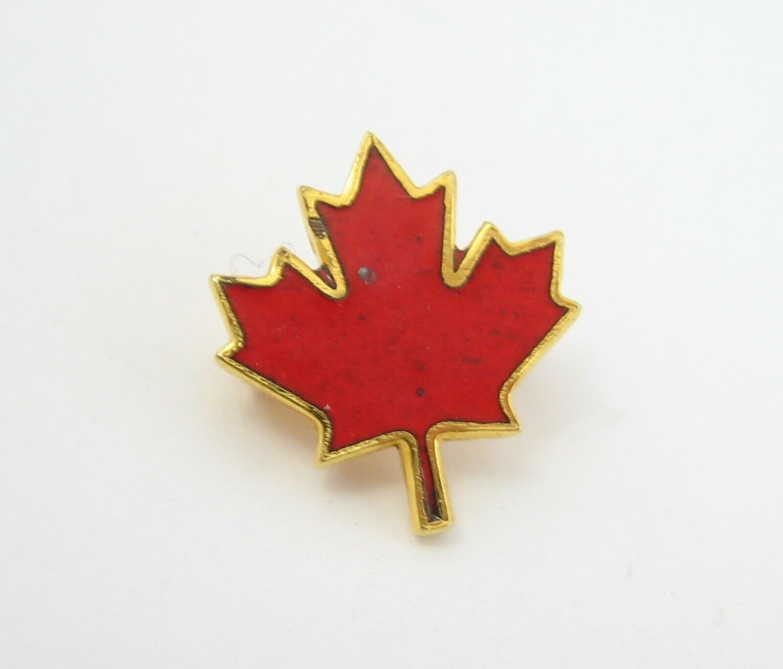 1. RED ENAMEL MAPLE LEAF - Goldtone metal and Red Enamel, Roll Over Safety Clasp, Marked "Made in Canada", measures 1/2"