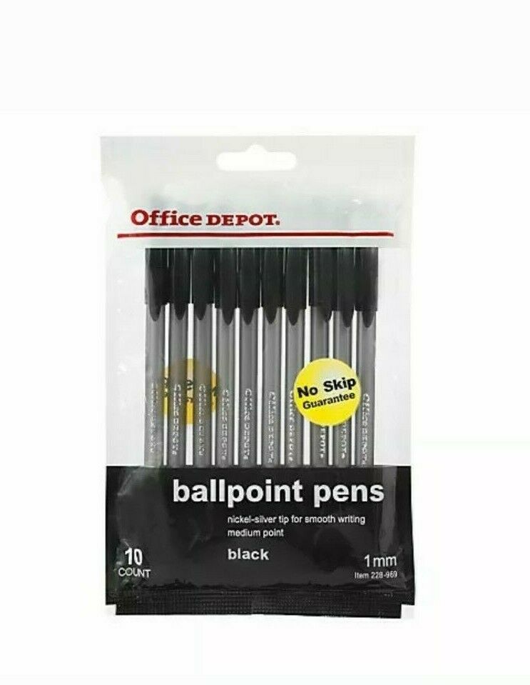 Office Depot Pack of 10 Black Nickel-Silver Ballpoint Pens Medium Ponit 1mm New sealed pack and will be sent fast