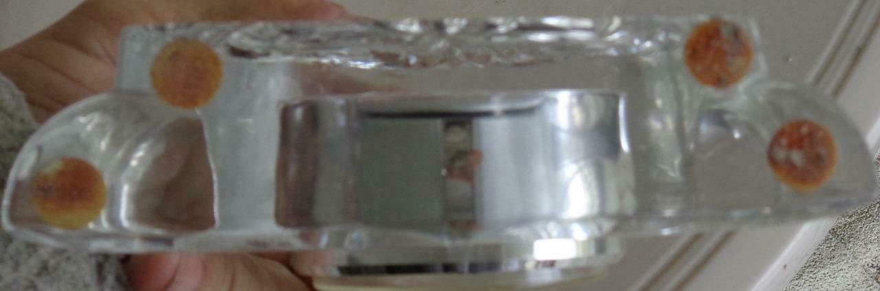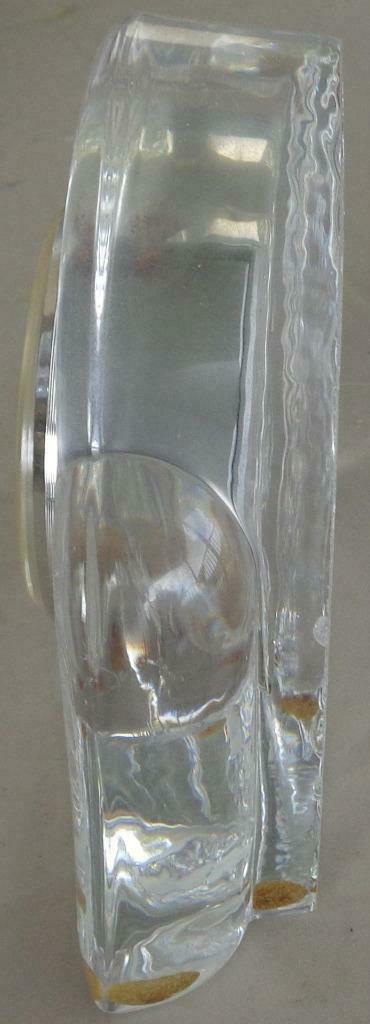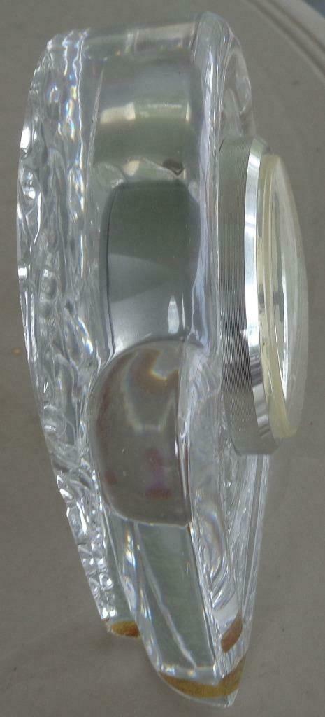 Offered here is this beautiful Staiger Quartz Clock made in West Germany. It is encased in a crystal frame and both clock and frame are in very good condition. The frame has no chips or cracks, but is a bit dusty and does need to be cleaned up a bit. There are some very light surface scratches on the front of the clock face, which is plastic. I am unsure of the exact age of the clock. The clock runs on one lr1 1.5 volt battery, which is not included. It is felted on the bottom so that it will not damage the shelf or mantle that it sits on. The clock is about 4.25" tall, is 5.25" wide and about 2" deep. The clock insert portion itself is 2.5" in diameter. The little clock simply pulls out of an indention in the crystal frame. The back of the clock comes out, allowing you to change the battery and set the clock. It is in good working condition. It is a beautiful Crystal collectible tabletop clock that would make a nice addition to a clock collection, as well as making a beautiful little Decor piece on up on a Shelf. It's small size allows it to fit just about anywhere.