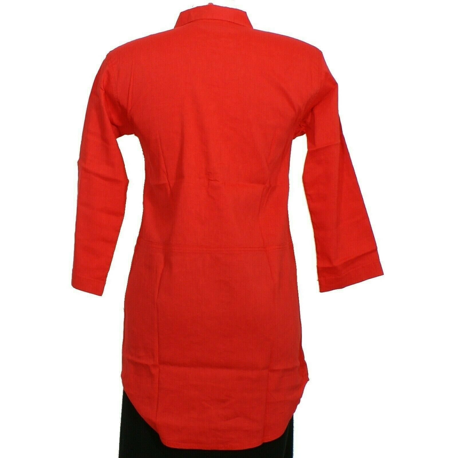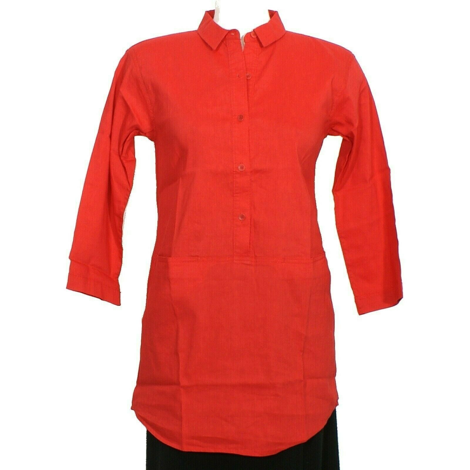 Red Linen Viscose Stretch Pocketed Classic Collar Tunic Top PP