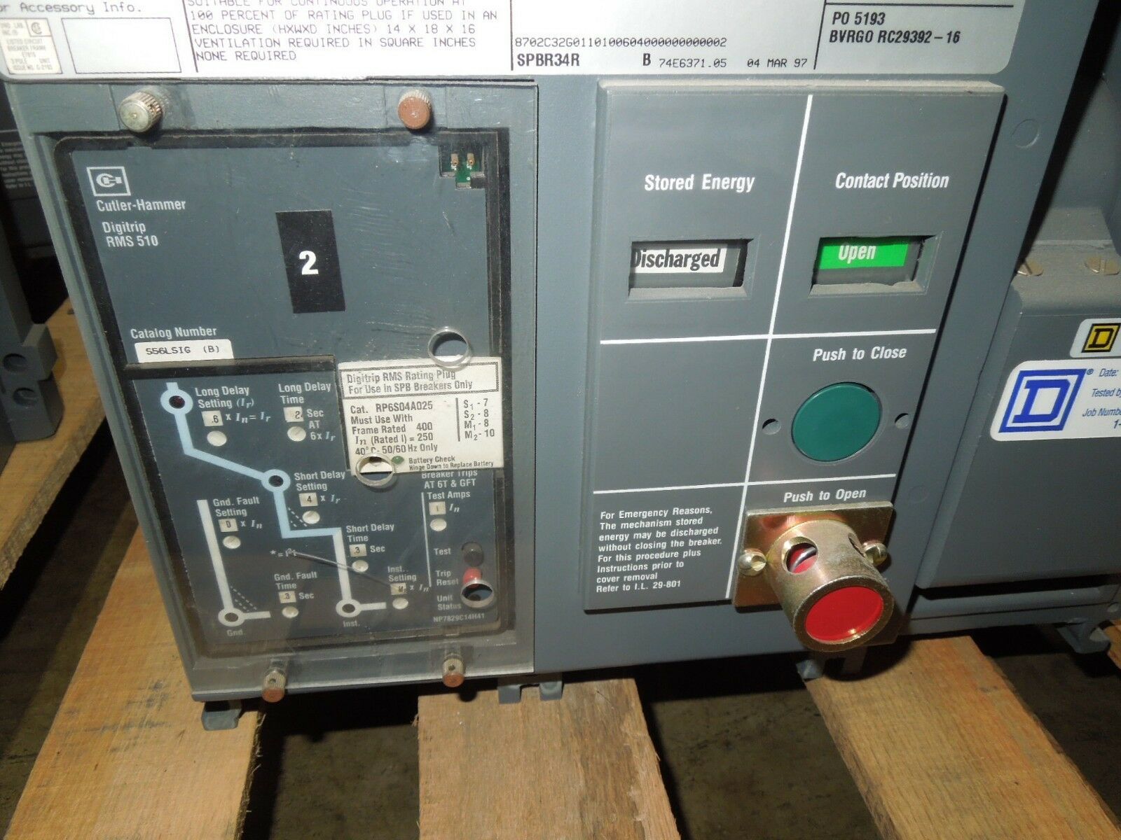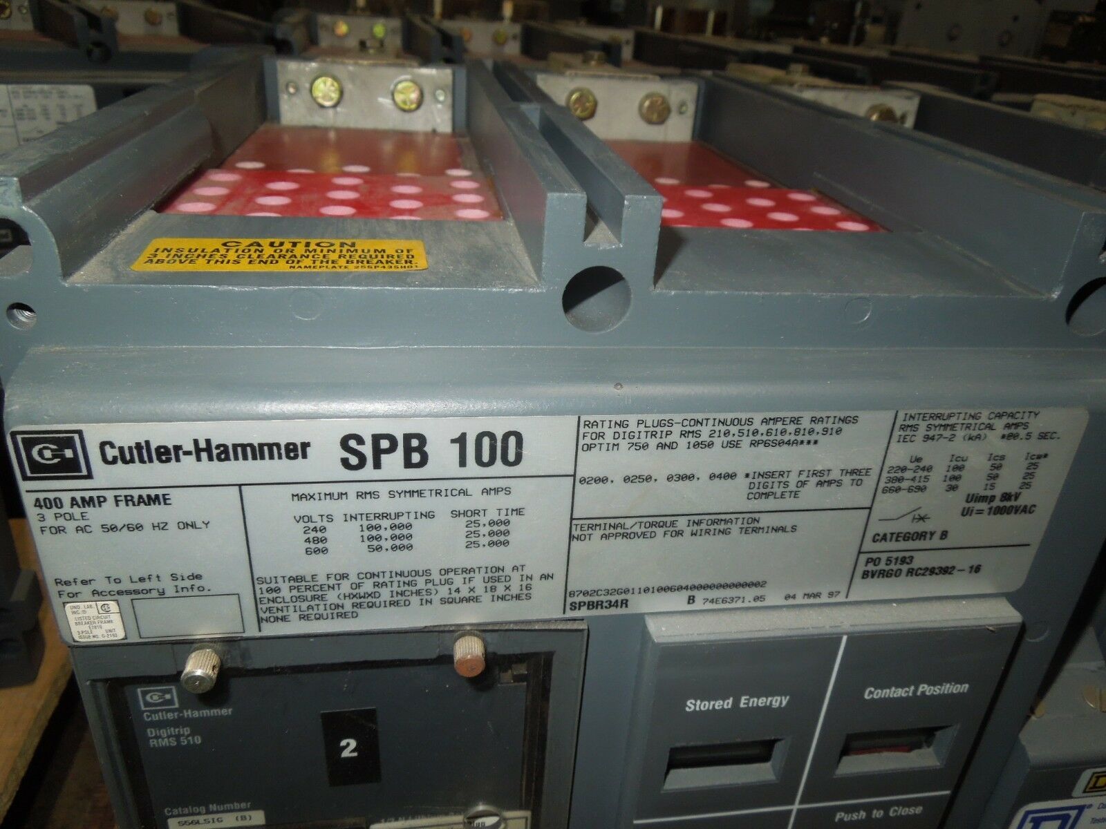 Cutler-Hammer SPB100 SPBR34R 400A Frame 250A Rated Pow-R Breaker RMS510 LSIG Bus
