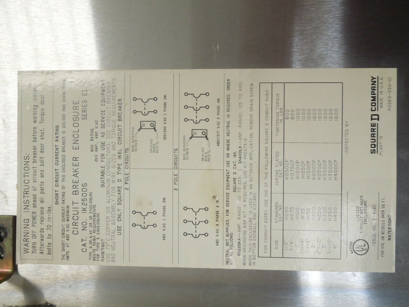 Square D IK250DS & IKL36225-1021 225A 3p 480V Breaker 3/3R/4/4X/5/12 Enclosure