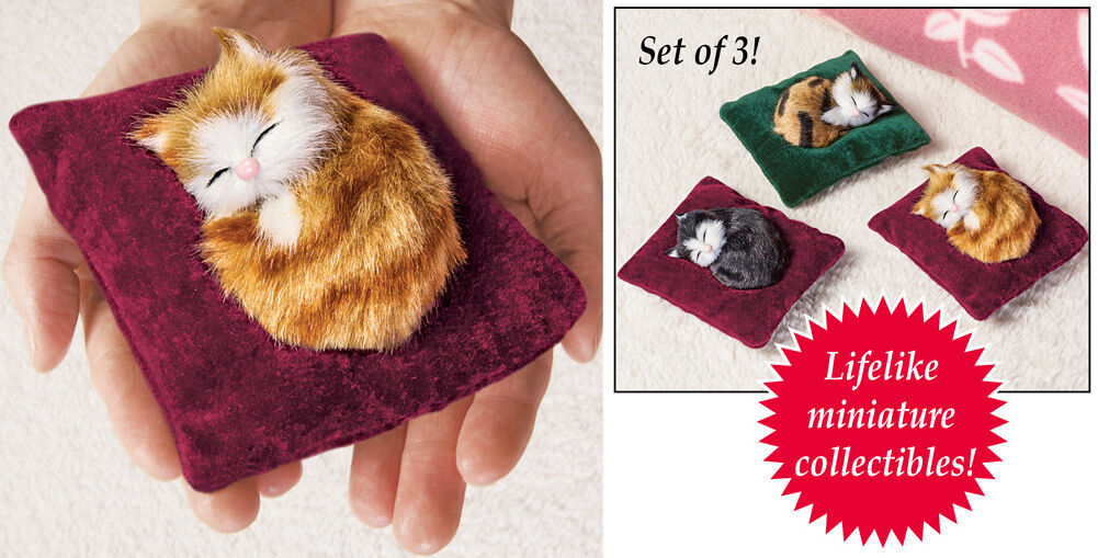 Set of 3 Lifelike Furry Kittens Sleeping on Pillows Collectible Animal Cat