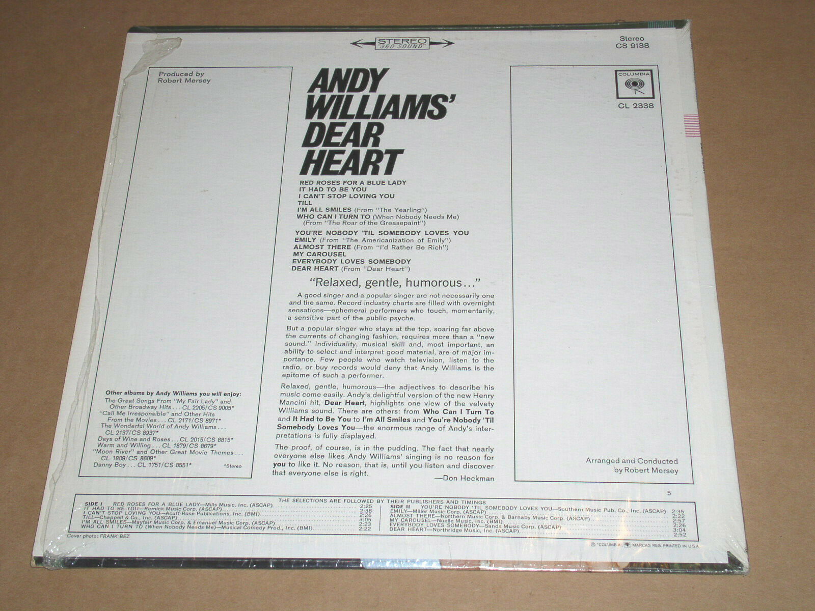 This is a vintage phonograph record album by Andy Williams, entitled, "Dear Heart". Record label: Columbia CS 9138 (Stereo). Original shrink wrap tightly on the cover.
