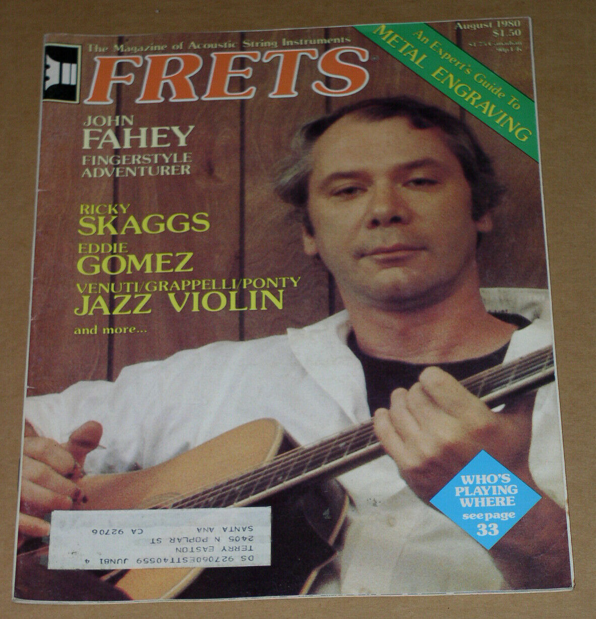 This is the August 1980 issue of "Frets" magazine. Cover story on John Fahey. Inside: Ricky Skaggs, Eddie Gomez, Venuti/Grappelli/Ponty.