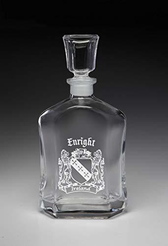 Enright Whiskey Decanter with Irish Coat of Arms - (Sand Etched). The classic and timeless design of this liquor decanter makes the perfect gift. The Irish Rose Gifts can etch over 1000 Irish family names and authentic coats of arms on this beautiful liquor decanter. A perfect wedding, groomsman, reunion, any-occasion gift. Authentic Irish coat of arm. Over 25 years of Heraldry Research. Heavy liquor glass decanter. Glass stopper with polyethylene under cap. 23.75oz capacity 5.25"Dx10.75". High quality permanent sand-etching.