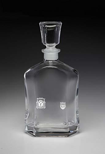 Product description: Mulholland Whiskey Decanter with Irish Coat of Arms - (Sand Etched). The classic and timeless design of this liquor decanter makes the perfect gift. The Irish Rose Gifts can etch over 1000 Irish family names and authentic coats of arms on this beautiful liquor decanter. A perfect wedding, groomsman, reunion, any-occasion gift. Authentic Irish coat of arm. Over 25 years of Heraldry Research. Heavy liquor glass decanter. Glass stopper with polyethylene under cap. 23.75oz capacity 5.25"Dx10.75". High quality permanent sand-etching.