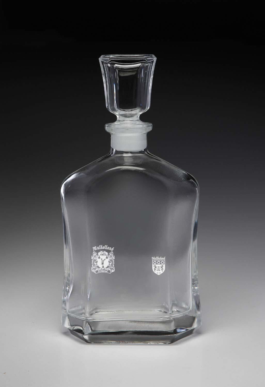 Mulholland Whiskey Decanter with Irish Coat of Arms - (Sand Etched). The classic and timeless design of this liquor decanter makes the perfect gift. The Irish Rose Gifts can etch over 1000 Irish family names and authentic coats of arms on this beautiful liquor decanter. A perfect wedding, groomsman, reunion, any-occasion gift. Authentic Irish coat of arm. Over 25 years of Heraldry Research. Heavy liquor glass decanter. Glass stopper with polyethylene under cap. 23.75oz capacity 5.25"Dx10.75". High quality permanent sand-etching.