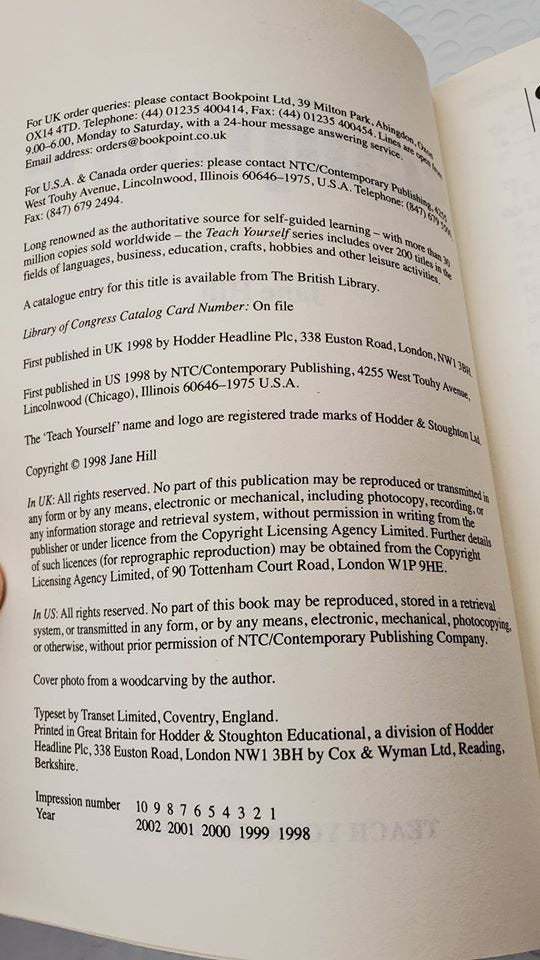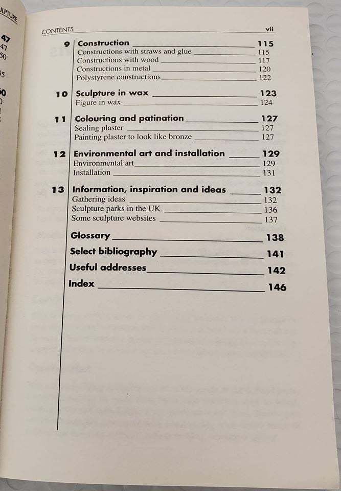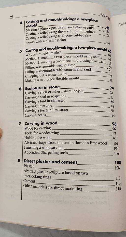 An introduction to the art of sculpture, from modelling and carving to simple construction. Designed for both beginners and the more experienced, it discusses technique, materials and the practical aspects of sculpting. Various media are discussed, including clay, cement, wax, stone and wood. This book, Sculpture by Jane Hill, is a Teach Yourself book. Published by NTC Publishing Group in 1998. ISBN 0-8442-0175-8.