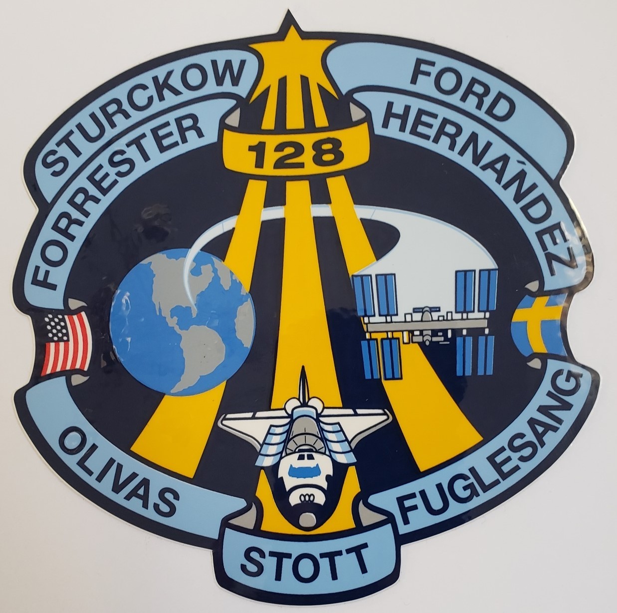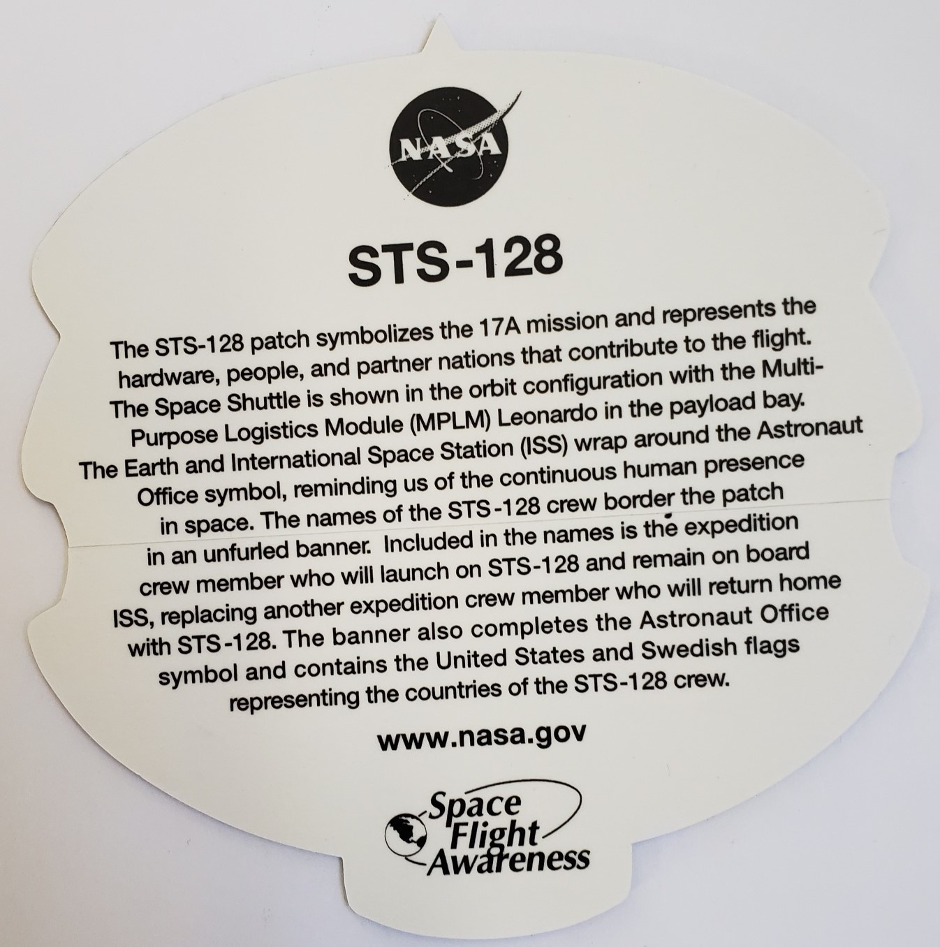 This is a special sticker for Space Shuttle STS-128 (SS assembly flight 17A) was a NASA Space Shuttle mission to the International Space Station (ISS) that launched on August 28, 2009. By Space Flight Awareness
