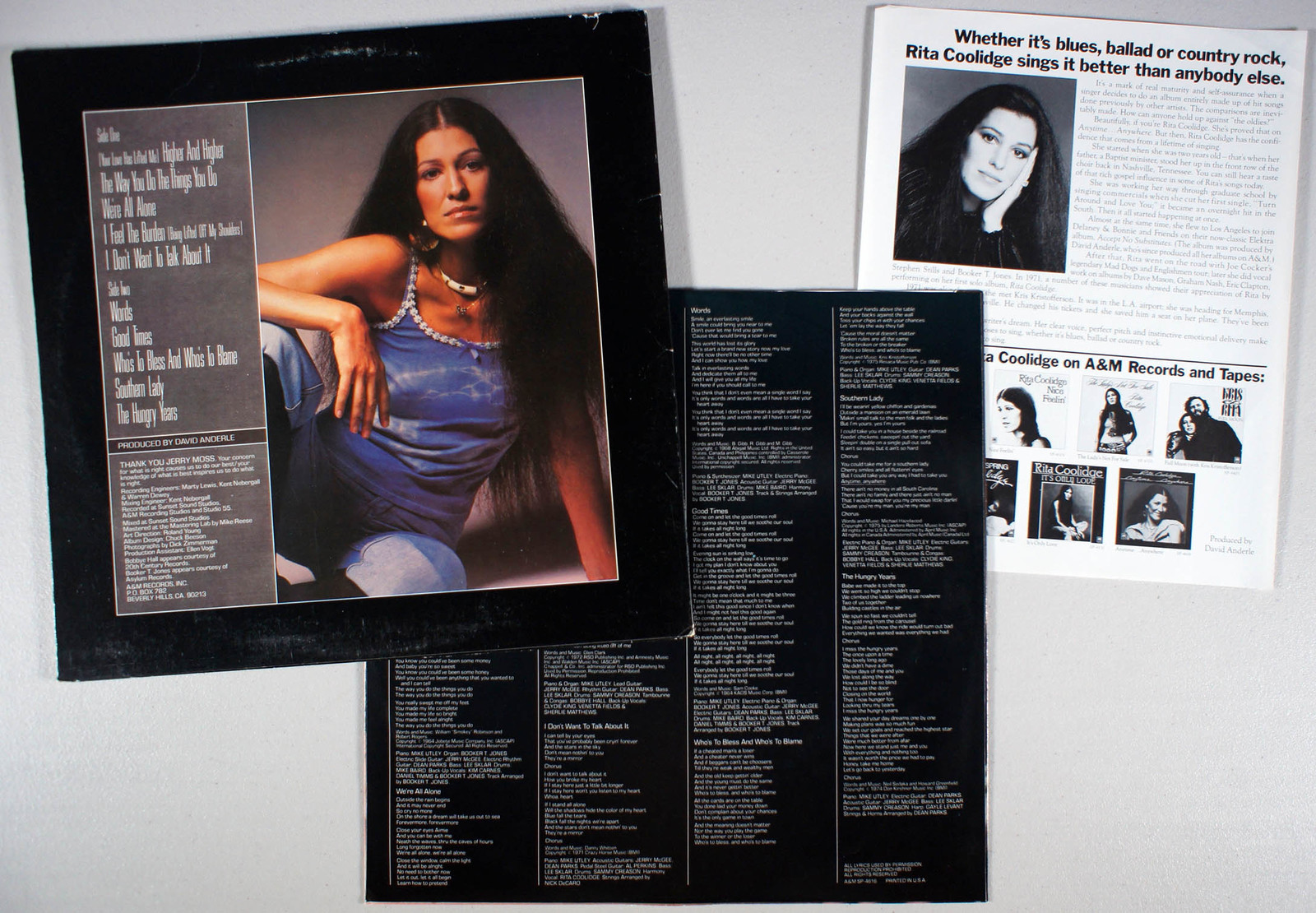 Anytime...Anywhere, by Rita Coolidge, is her most successful, reaching No. 6 on the Billboard 200 and having been certified platinum (over 1 million U.S. copies sold). The album spawned three Billboard top twenty hits; a cover of Boz Scaggs' We're All Alone (No. 7), a cover of The Temptations' The Way You Do The Things You Do (No. 20), and the album's biggest hit, (Your Love Has Lifted Me) Higher and Higher (No. 2), a remake of Jackie Wilson's (Your Love Keeps Lifting Me) Higher and Higher.