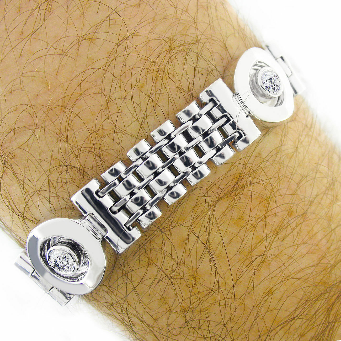 This handsome men's diamond bracelet features flexible links with 4 round brilliant colorless diamonds in bezel setting. Bracelet has a diamond encrusted double safety hidden lock for elegant look. Handcrafted in 14-karat solid white gold and finished with a high polish. We use special Italian techniques of jewelry production, resulting in a luxurious finish of our bracelets. All our bracelets come with a limited warranty protecting links and fastenings.