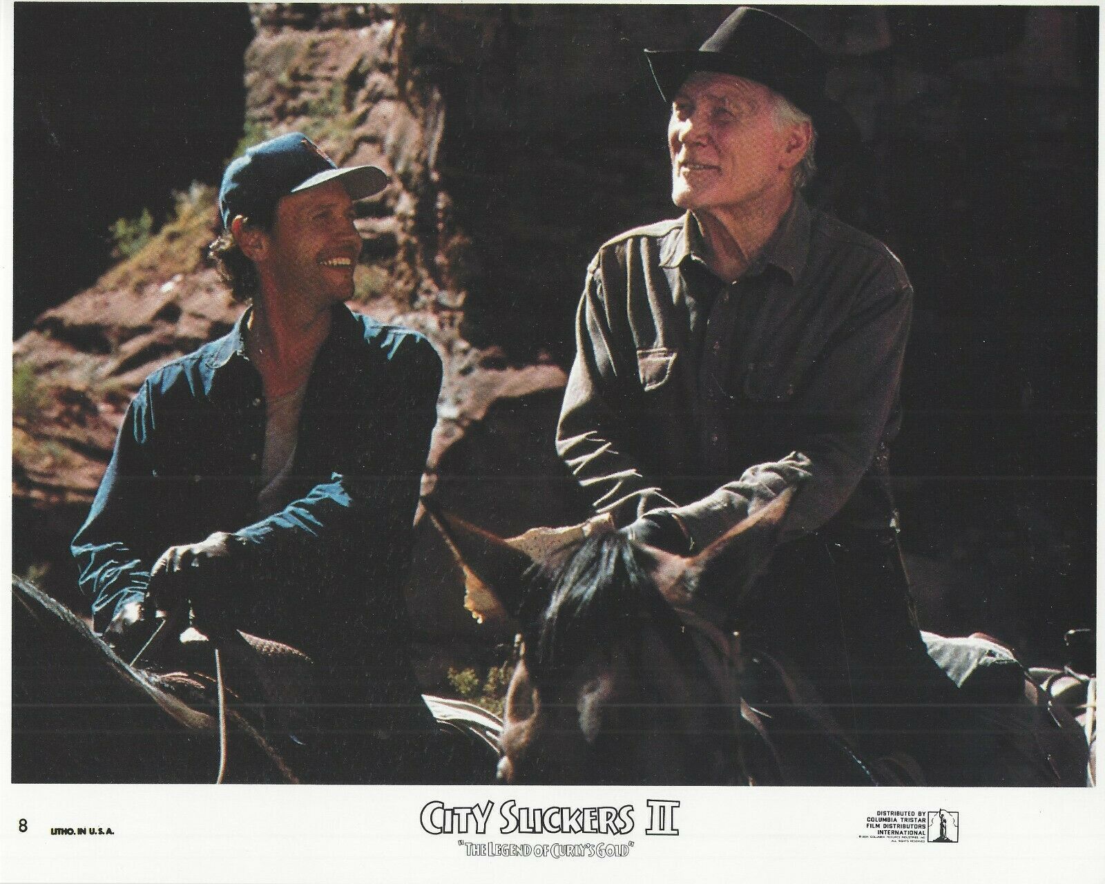 The City Slickers II fans! This item is your calling featuring an actual authentic Lobby Card distributed from the movie production company to a movie theater! Movie: City Slickers II mdash; Starring: Billy Crystal, Daniel Stern, Jon Lovitz, Jack Palance mdash; 8x10 Photo mdash; Copyright Year: 1994 mdash; Lobby Card Size: 8" x 10" mdash; NOT A Bootleg or Reproduction *Please note this item has been scanned and there may be scan lines in the graphic but there are not any lines in the actual lobby card itself. Please disregard any lines that appear in the image. -Guaranteed ORIGINAL THEATRICAL LOBBY CARD PRODUCED FOR MOVIE THEATERS AROUND TIME OF RELEASE OF THE MOVIE. CONDITION: Poster is in -Vintage Condition- and of investment quality. This ORIGINAL lobby card could have been used at a movie theater or may not have been. It may or may not have staple marks at corners, wrinkling, slight tears around edges, rounded corners, etc. from being originally displayed at a movie theater or overtime natural wear. Colors and Detail are outstanding for this day amp; age, photos may not completely pick up high quality of coloring and inks until you see in hand. -PLEASE MAKE YOUR PERSONAL ASSESSMENT OF THE CONDITION OF THIS POSTER FROM THE PHOTOS PROVIDED IN THE LISTING. The above condition issues are not exact for this poster so please take a look at the photos to determine the condition. We ship our items very protected and safe in plastic top loaders, so they are safe and secure when in the mail.