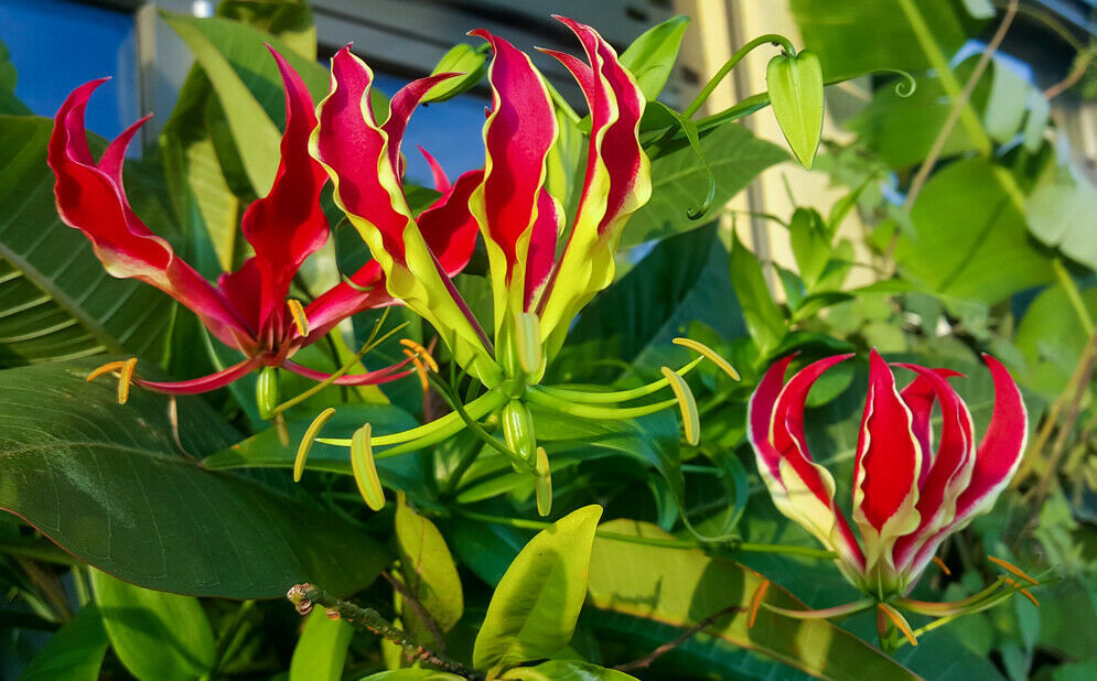Gloriosa superba, commonly called gloriosa lily or climbing lily, is a tropical vine which grows to 6’. Climbs by tendrils at the leaf tips. Lily-like flowers with 6 showy petal-like segments of bright red edged with bright yellow. Blooms summer to fall. When in bud, the flower faces downward but when in bloom, the petals are strongly reflexed backwards. The flowers are 4 to 5 in. wide with wavy-edged petals that are ruby red with yellow bases and edges and large, bright green stamens and pistils that spread out below the petals. It will quickly grow up a trellis using the tendrils formed at the tips of the leaves, growing from 5 to 6 ft. tall and 1 to 3 ft. wide. It is also known as Gloriosa rothschildiana.