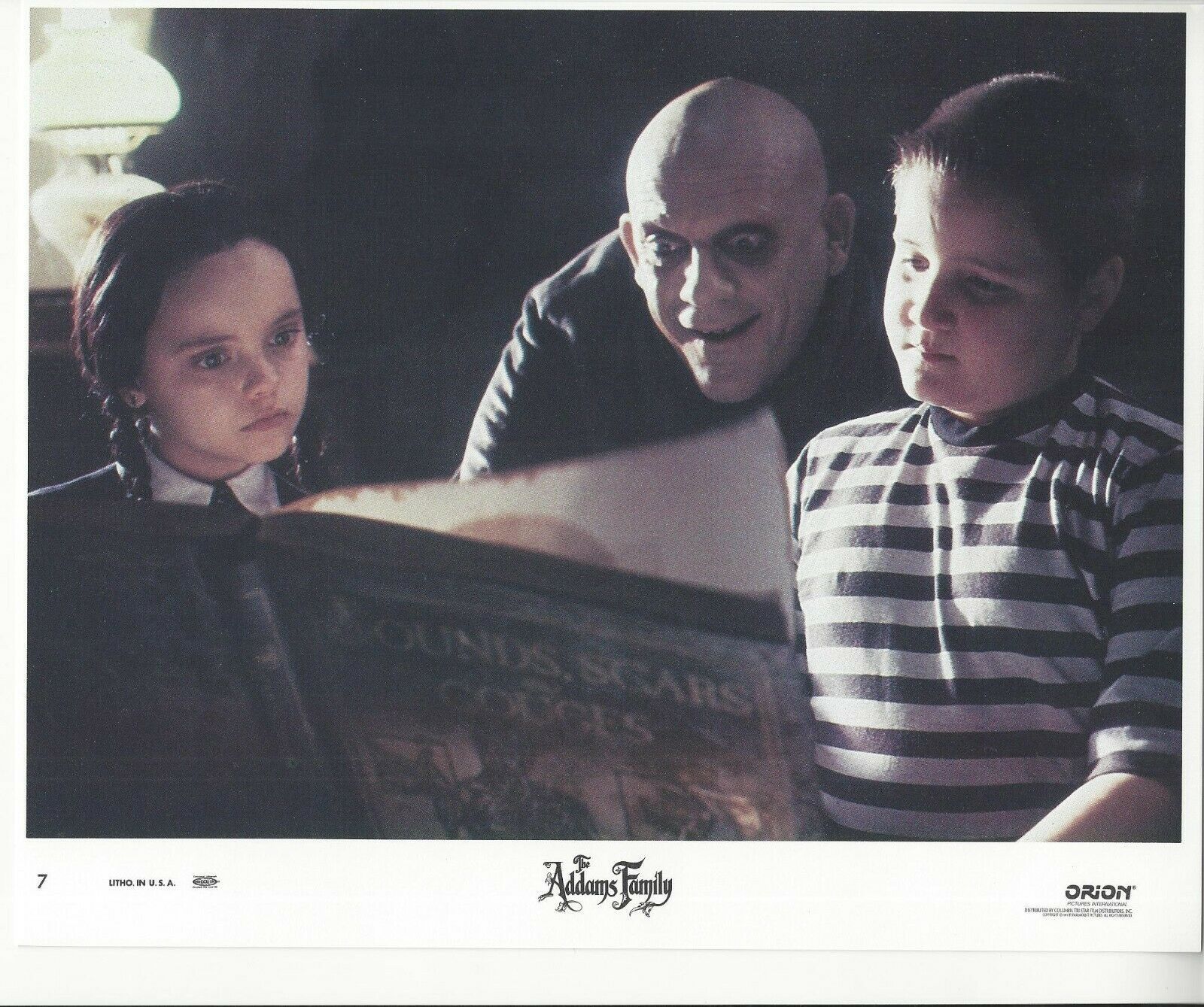 Addams Family fans! This item is your calling featuring an actual authentic Lobby Card distributed from the movie production company to a movie theater! Movie: Addams Family mdash; Starring: Anjelica Hustin, Raul Julia, Christopher Lloyd mdash; 8x10 Photo mdash; Copyright Year: 1991 mdash; Lobby Card Size: 8" x 10" mdash; NOT A Bootleg or Reproduction *Please note this item has been scanned and there may be scan lines in the graphic but there are not any lines in the actual lobby card itself. Please disregard any lines that appear in the image. -Guaranteed ORIGINAL THEATRICAL LOBBY CARD PRODUCED FOR MOVIE THEATERS AROUND TIME OF RELEASE OF THE MOVIE. CONDITION: Poster is in -Vintage Condition- and of investment quality. This ORIGINAL lobby card could have been used at a movie theater or may not have been. It may or may not have staple marks at corners, wrinkling, slight tears around edges, rounded corners, etc. from being originally displayed at a movie theater or overtime natural wear. Colors and Detail are outstanding for this day amp; age, photos may not completely pick up high quality of coloring and inks until you see in hand. -PLEASE MAKE YOUR PERSONAL ASSESSMENT OF THE CONDITION OF THIS POSTER FROM THE PHOTOS PROVIDED IN THE LISTING. The above condition issues are not exact for this poster so please take a look at the photos to determine the condition. We ship our items very protected and safe in plastic top loaders, so they are safe and secure when in the mail.
