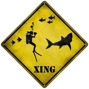 Scuba Diver Xing Novelty Mini Metal Crossing Sign. 8.5" Mini Crossing Sign, made of the highest quality aluminum for a weather resistant finish. It is lightweight and durable and has pre-drilled holes for quick and easy mounting. Personalize with ribbon, wire or string. Individually shrink-wrapped and proudly made in the USA.