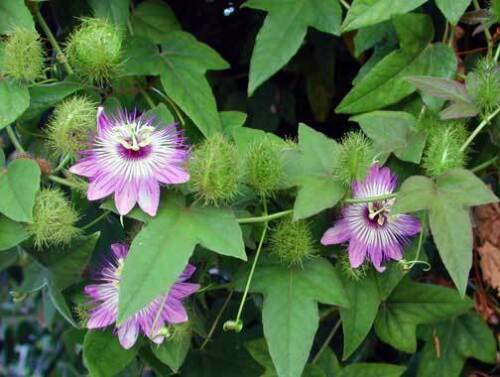 Love-in-a-Mist is a species of passionflower that has delicate, white and purple flowers. The flowers have finely divided bracts that encircle the buds, which give this plant its common name. It is a perennial vine. The vines have bright green, tri-lobed leaves and long tendril, which it uses to climb on fences and other plants. It can also grow along the ground as a sprawling vine. The flowers are followed by globose, bright red or orange fruits. The fruits are edible. It grows well in full sun and part shade. Native to the southwestern United States and tropical America. Hardy in zones 9-11.