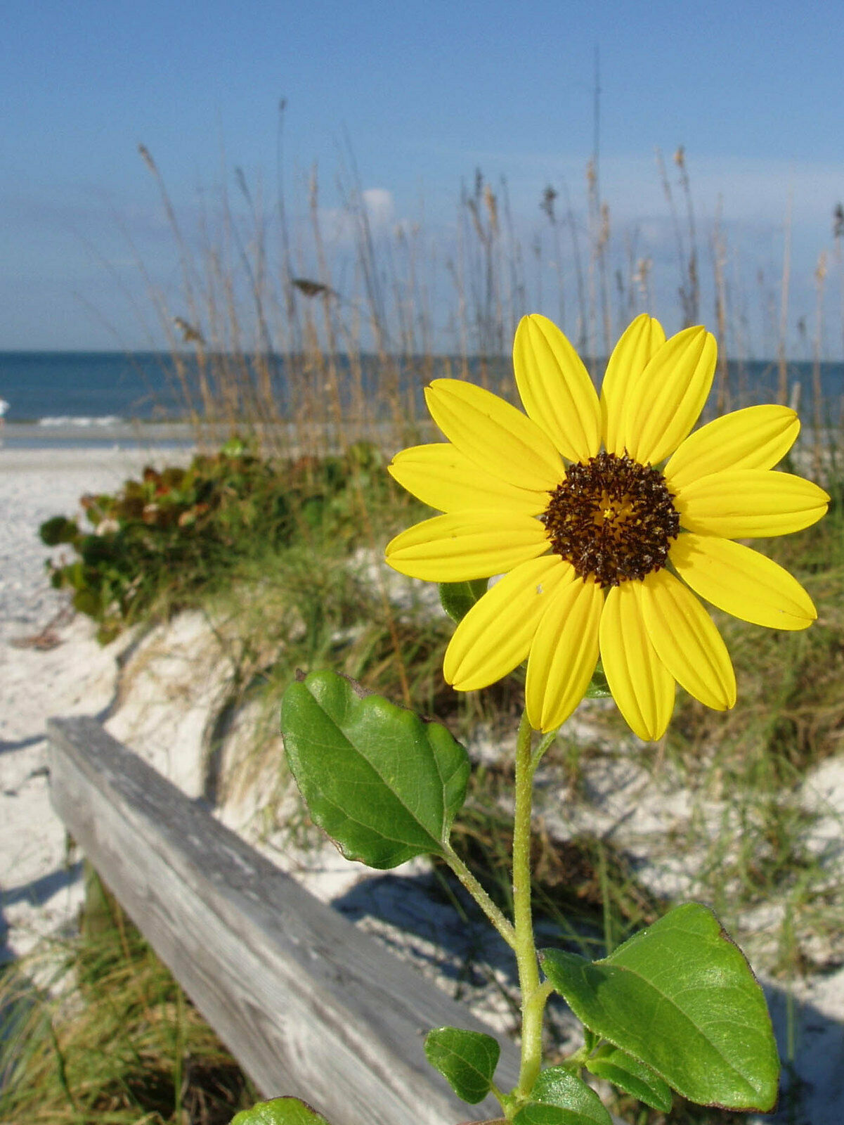 Florida native Helianthus debilis (Dune Sunflower, Beach Sunflower) is one of the easiest to grow wildflowers. The beach sunflower is a sprawling, herbaceous groundcover that produces many yellow, daisy-like flowers. Its leaves are deltoid-shaped, with rough surfaces and toothed margins; they are alternately arranged. Blooms consist of brownish-red disk florets surrounded by bright yellow ray florets. Dune sunflower typically flowers in the summer, but may flower year-round in South Florida. Its flowers attract a variety of pollinators, including butterflies, moths and bees. Its dense growth pattern provides cover for many small animals, while its seeds are eaten by birds.