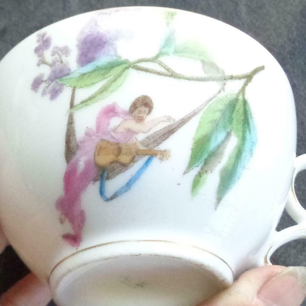 Offered here is this Antique Hand Painted Flat Tea Cup. The cup is marked simply A. K. on the bottom. I am unsure of its actual age. It is in very good condition, with no chips or cracks, although it is a bit dusty and will need to be washed. I would hand wash it only, as it has a lovely over glaze hand painted design on it. It is a unique design that I have never seen before, of a maiden in a sort of hammock, playing what looks like a violin or guitar. The cup is 2.25" tall, 2" deep, 3.5" in diameter at the top, 1.75" in diameter at the base ring, with the handle adding another inch to that side. This is a beautiful antique teacup, with a unique hand painted pattern on it. It would be a lovely addition to any antique china collection.