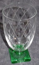 Offered here is this Beautiful Antique Depression Glass Footed Juice Glass. The glass is in very good condition with no chips or cracks. It is a clear body and green base, with a beautiful etched cross and leaf pattern on it. I am unsure of the age or maker of the glass. The glass is good, high quality glass, is a smaller juice glass size, measuring 4" tall, 3" deep, 2.25" in diameter at the top rim, and just over 1.5" in diameter at the base. It is a beautiful piece of depression glass, and would be a very nice addition to any antique glassware collection.