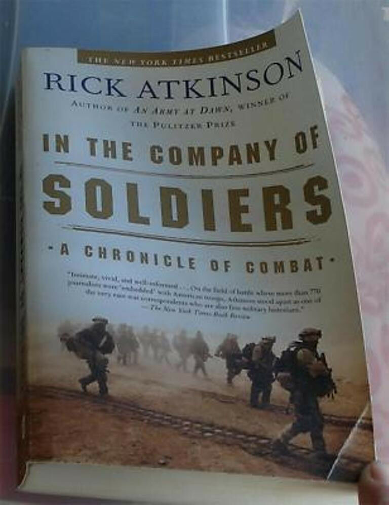 You are bidding on this first Owl Books edition of In The Company of Soldiers, by Rick Atkinson . It was published by Owl Books, and has a copyright date of 2005. It is in very good condition. The cover has some very slight wear at the corners and edges, and some creases at the corners. The front cover is also a little curled up, both front and back covers have some light scuffs on them. The binding is good, and all 322 pages including index are intact and in good condition. This is a very nice book written about first hand experience in Iraq.