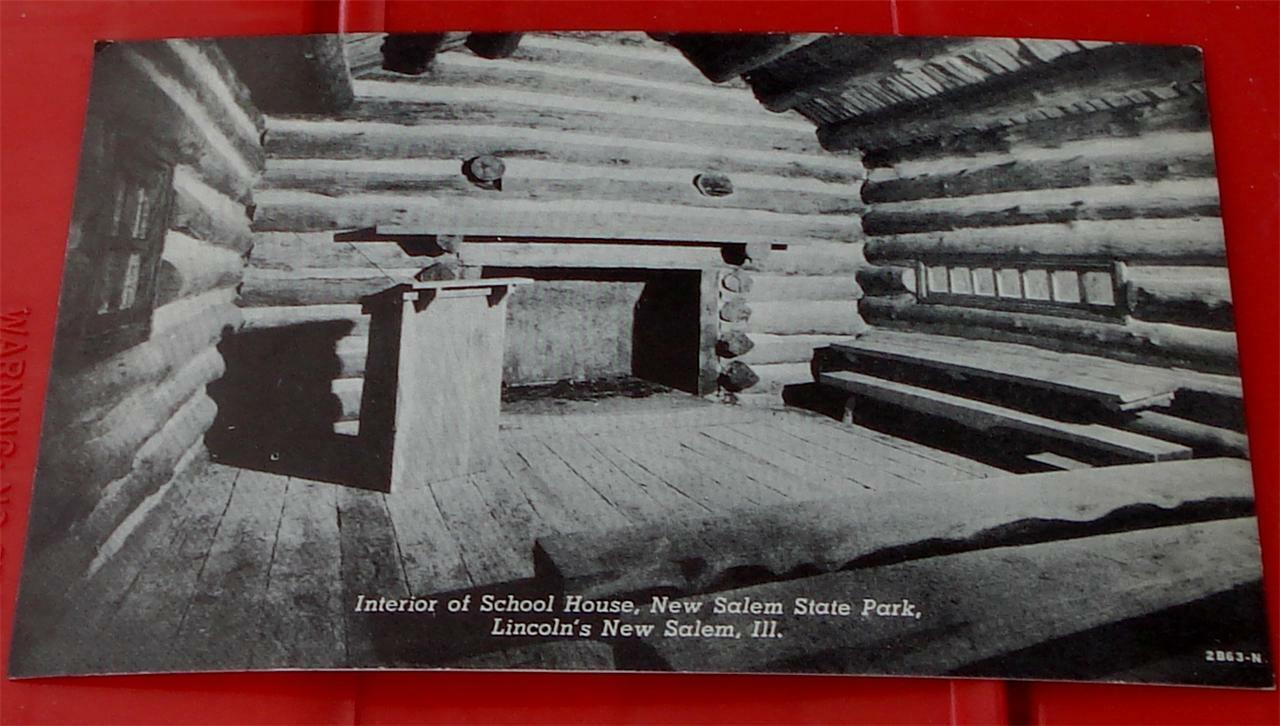 You are bidding on this nice black and white photograph postcard. The postcard is from Interior of School House, New Salem State Park, Lincoln’s New Salem, Ill., and is in good condition, with some light wear at the edges and especially at the corners, and some light stains on the back. The postcard is unused postally, and has a caption on the back that reads; School and Church. Removed a little distance from the village is the school and church. Mentor Graham conducted a “subscription school” and the building was also used as a church. Historic New Salem State Park is located near Petersburg on Highways 97 and 123 about 17 miles northwest of Springfield, Illinois... It is 3.5” by 5.5” and is a nice black and white photo postcard.
