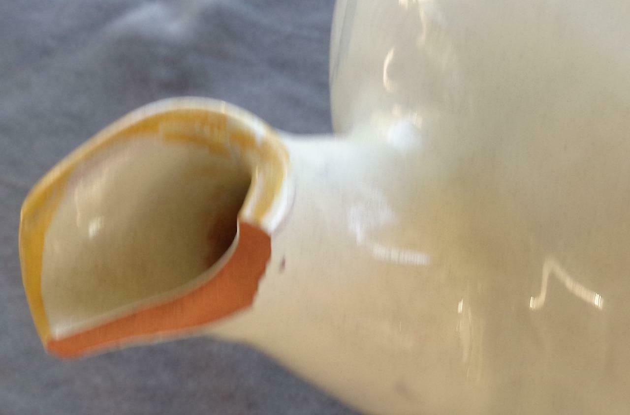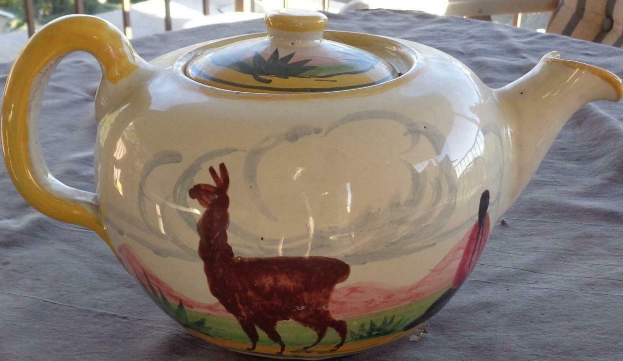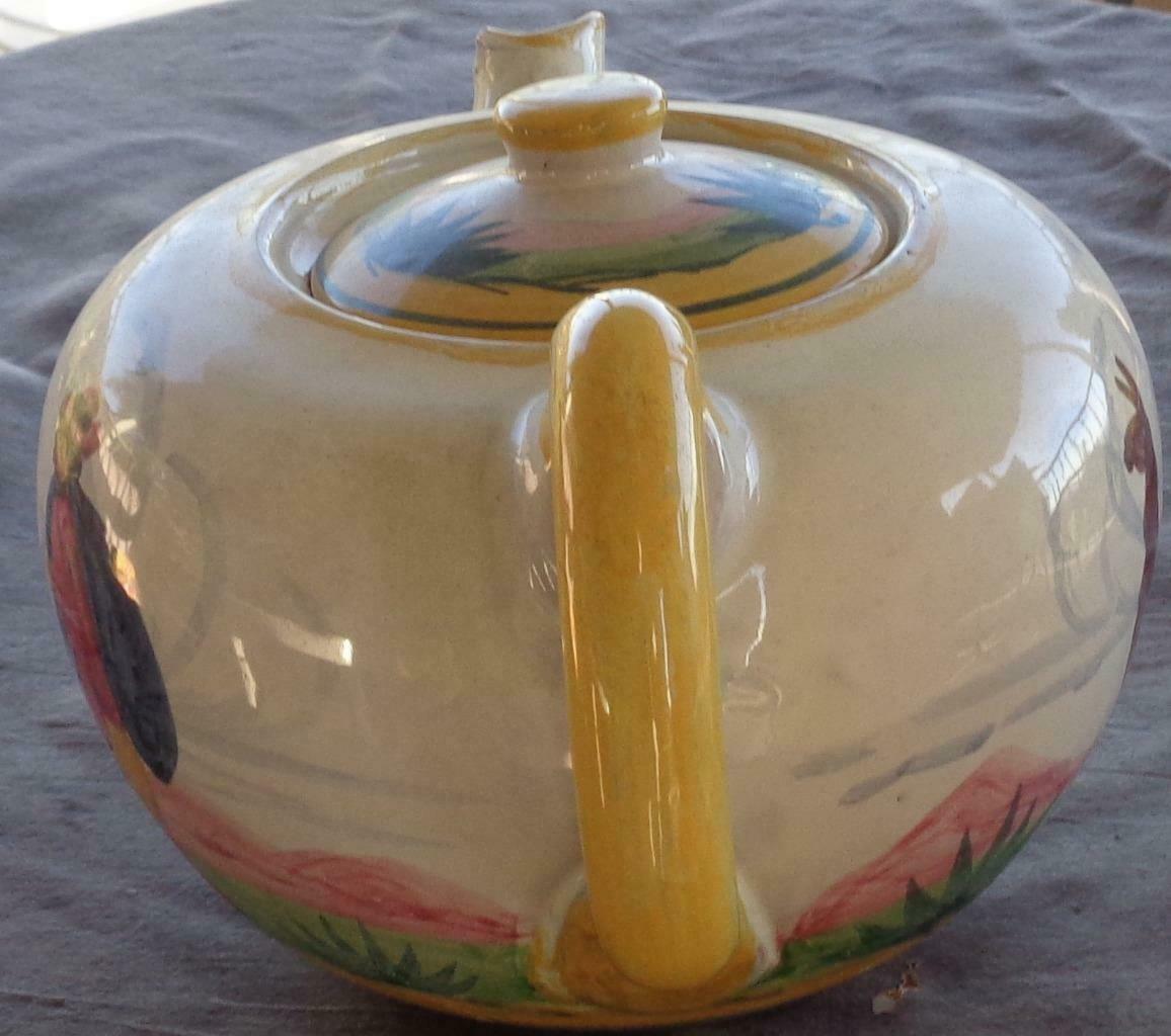 Offered here is this Fabulous Vintage Terracotta Handcrafted Teapot from Peru. It has a lovely, colorful hand-painted design on it, under glaze, and is in good condition, with no cracks, however there is a large chip in the tip and side of the spout. I am unsure of the exact age of the teapot, however, I do know that it is from Peru and was handcrafted and hand-painted. It is about 5.5"tall at the top of the lid handle, 5" tall at the rim, 4.5" deep, 11" across from spout to handle, and about 6" in diameter. It is a beautiful piece of collectible handcrafted terracotta pottery from Peru that would make a fabulous addition to any collection.