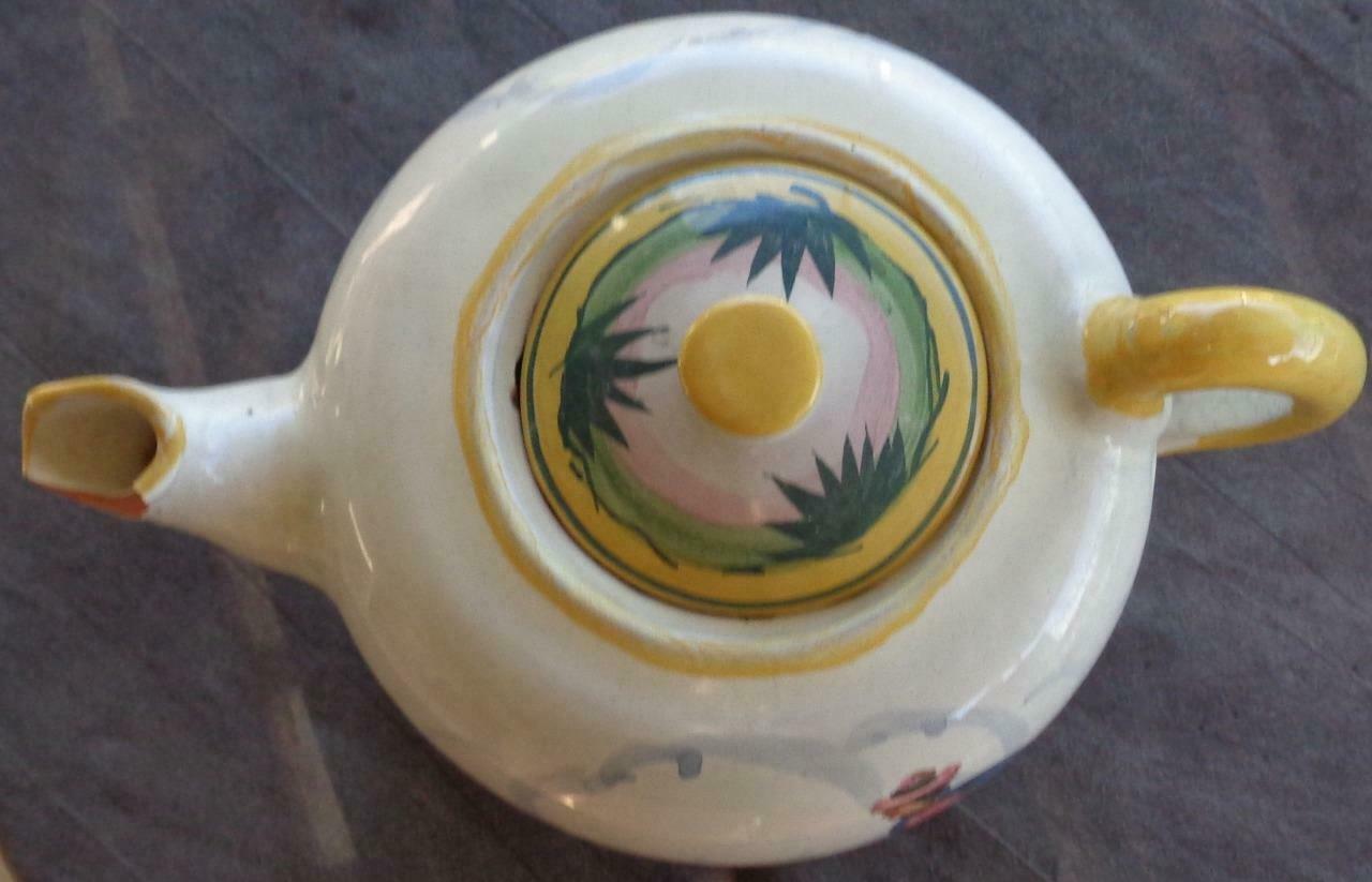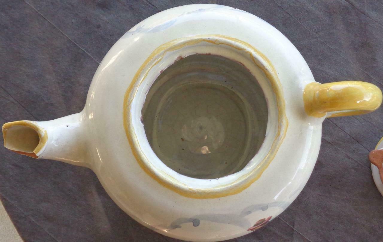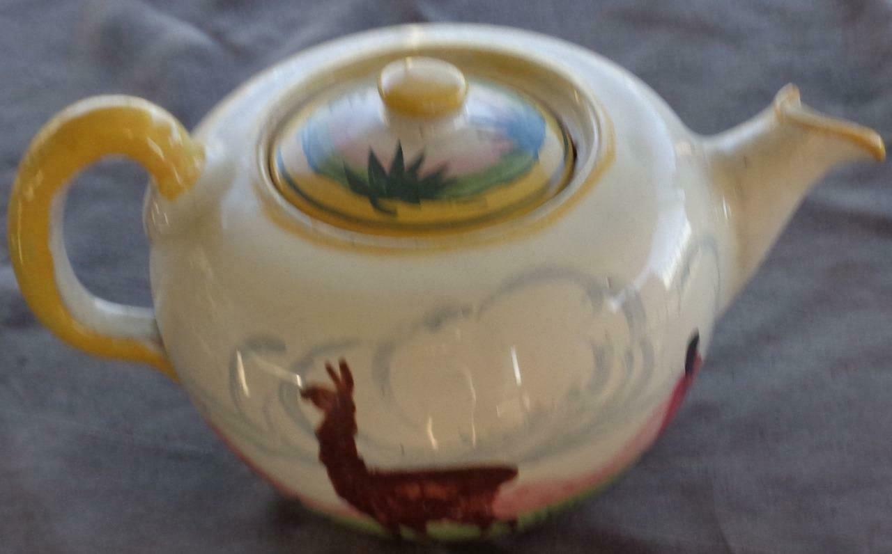 Offered here is this Fabulous Vintage Terracotta Handcrafted Teapot from Peru. It has a lovely, colorful hand-painted design on it, under glaze, and is in good condition, with no cracks, however there is a large chip in the tip and side of the spout. I am unsure of the exact age of the teapot, however, I do know that it is from Peru and was handcrafted and hand-painted. It is about 5.5"tall at the top of the lid handle, 5" tall at the rim, 4.5" deep, 11" across from spout to handle, and about 6" in diameter. It is a beautiful piece of collectible handcrafted terracotta pottery from Peru that would make a fabulous addition to any collection.