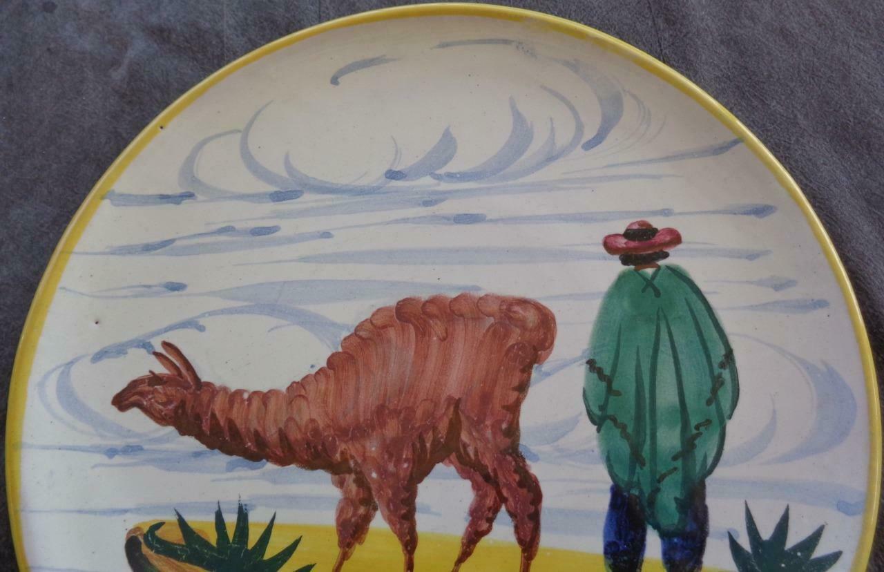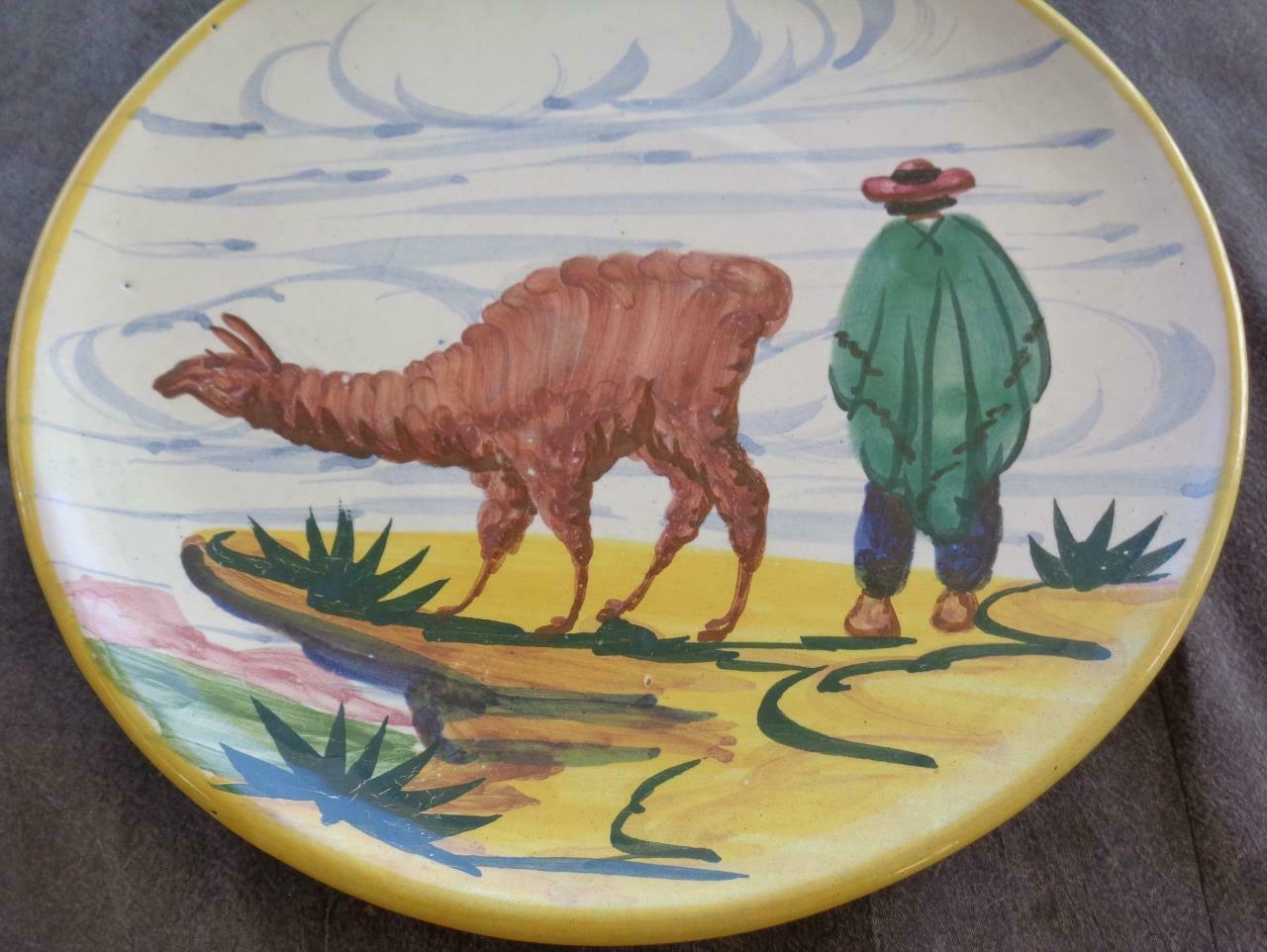 Offered here is this Very Nice Vintage Terracotta Glazed Hand-Painted 7.5" Salad Plate from Peru. It is in very good condition, with no chips or cracks, however, there are a few bubble pop holes in the glaze as well as a few small glaze chips. I am unsure of the exact age of the plate, but I know that it is an older piece. It measures 7.5" in diameter and has a hand-painted under glaze design on it. It is a very nice plate that would be a fabulous addition to any vintage Peruvian Pottery collection.