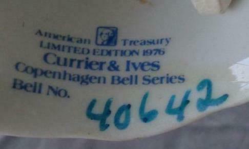 Offered here is this nice vintage ceramic Delfts Blue collectible bell. It has a pretty design transferred onto the bottom of the bell, and is in very good condition, with no chips or cracks, and the clapper is intact as well. The bell is An American Treasury Limited Edition from 1976. It is the Currier Ives design from the Copenhagen Series, and is bell number 40642. It is 5.5โ tall, and is 3โ in diameter across the bottom of the bell. It is a very nice collectible bell, and a great addition to any bell collection.