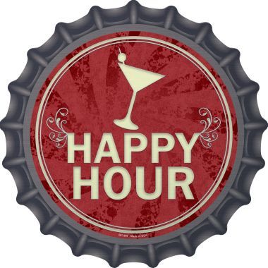 Happy Hour Novelty Metal Bottle Cap BC-844. Made of the highest quality aluminum for a weather resistant finish. It is lightweight durable. Pre-drilled holes for quick and easy mounting. Add a ribbon, wire or string to instantly personalize your sign. Individually shrink-wrapped and proudly made in the USA.