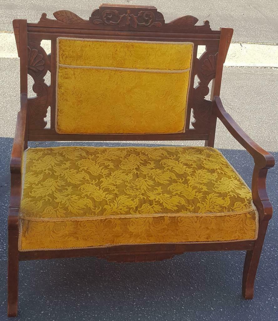 Offered here is this Beautiful Victorian Settee. It has gorgeous carved wood accent details. It is in surprisingly good condition for its age. I am unsure of its exact age, however, I would date it to around the late 19th Century. The upholstery is done in an embossed velvet material. It is gold in color and is plush and luxurious. The applied trim is coming loose over much of the upholstery, however, it is not torn, and could easily be refastened. The upholstery has some light stains on it, however, there are no tears or holes. It is quite worn where the trim is coming loose, however. The setee is about 34" wide across the back. It is 34.5" wide across the arms. It has an inside diameter of 32" across the arms at the front, and about 30.25" at the back. The seat is 15" high. The back is 34.5" high at the sides and 37" high at the center. The arms are 22" high. The settee is 23" deep at the seat, and about 25" deep total. The carving on the piece is very detailed and exquisite. The finish has a few small chips and some surface scratches on it. It has fabulous patina. I am unsure of the type of wood that it is made from. It is a gorgeous antique piece and a must-have for any Victorian collector.