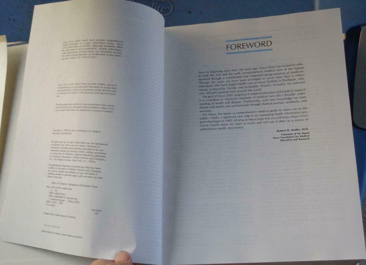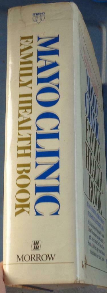 Offer here is this wonderful hardcover 1990 addition of the Mayo Clinic Family health book. The ultimate Illustrated Home Medical reference guide. Features easy-to-understand authoritative resource features with instant access in these vital areas: first aid and emergencies, symptoms and what they mean, complete information on pregnancy, infant and child care, advice on nutrition, stress, Fitness, and disease prevention, useful facts of Aging, treatment explanations in hundreds of medical areas, and much much more... The book is in very good condition with only a little bit of wear at the spine and, however, the dust jacket has some tears along the edges, is taped at the tops spine Edge, and has a lot of stains on it as well. The Binding is good and all 1378 Pages including index are intact and in good condition. The book was published by the Mayo foundation for Medical Education and Research. It is a first edition but not a first printing. It is a very nice resource guide for any home to have on hand.