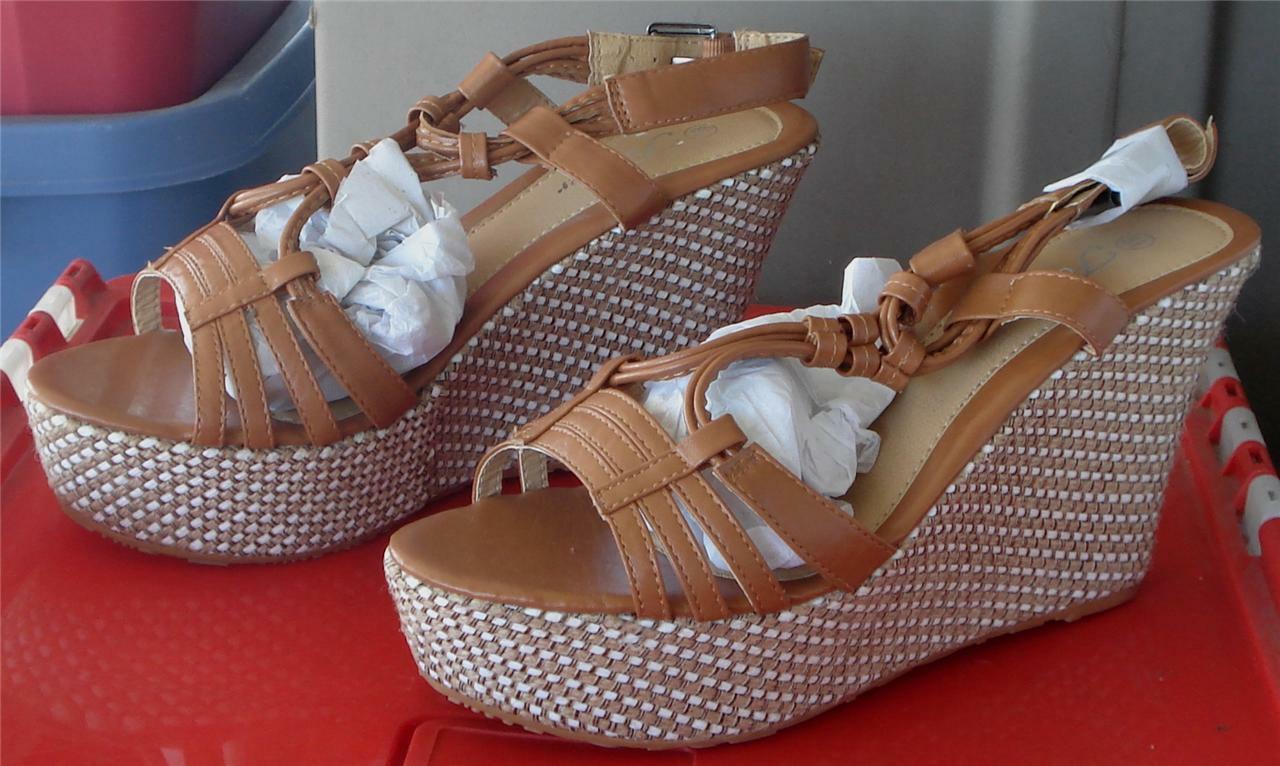 NEW WITH BOX Forever Women's Tan Open Toe Wedge, Size 8.5 GREAT DESIGN