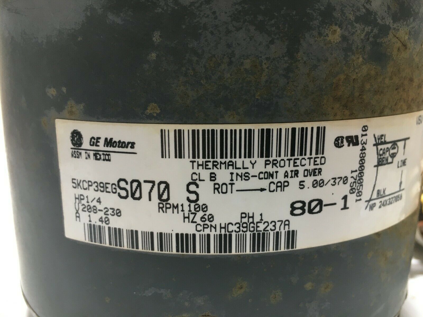 This is Carrier Condenser Motor HC39GE237A Genteq 5KCP39EGS070S 1100RPM 1/4 HP 208-230 V 1 PH used part.