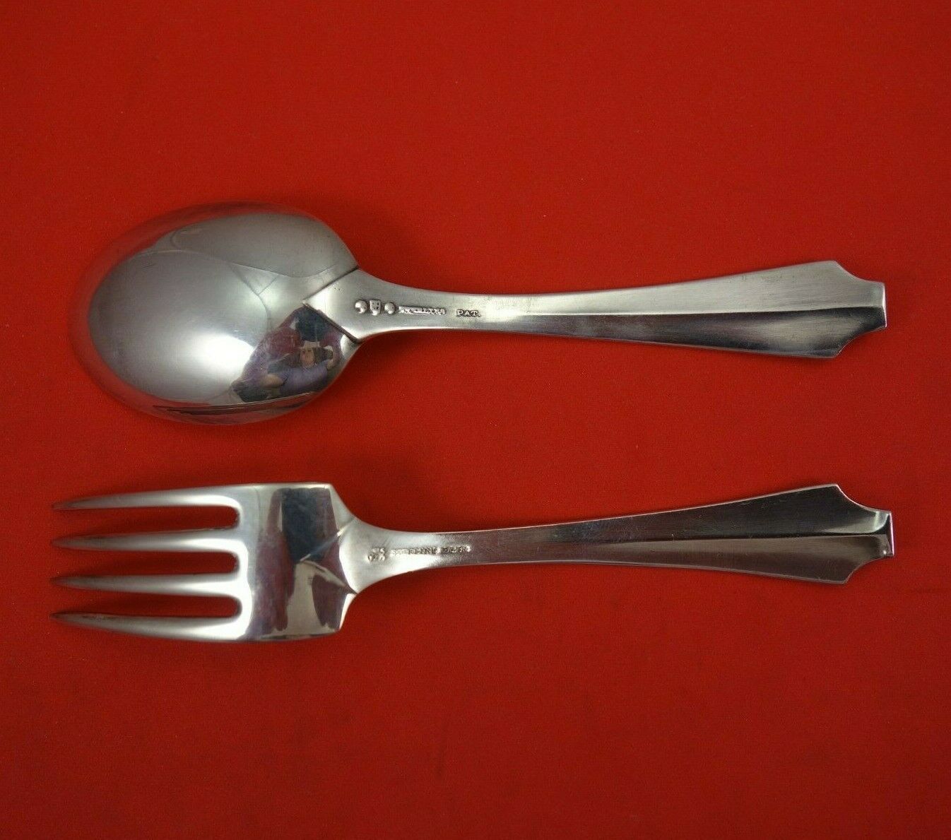 Sterling silver original Baby Set 2-Piece 4 1/2" in the pattern King Albert by Whiting. It is not monogrammed and is in excellent condition.